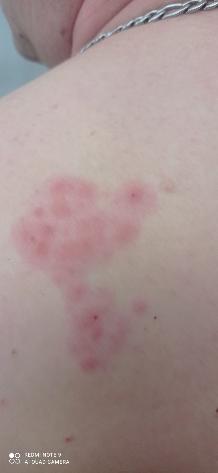 @hojda ložisko nad lopatkou se nezvětšuje. Ložiska kolem vnitřní strany lokte se nezvětšují. Bolí ho rameno v okolí vpichu a šlo mu to až do prstu. Objevují se nové samostatne pupínky kdekoliv na horní polovině těla. Záda,páteř neboli, svědí a tlačí prý jakoby, ty ložiska. Byla i teplota kolem 38.