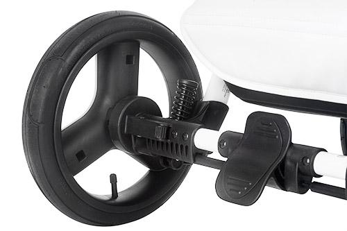 kolečka nafukovací (otočná s možností fixace) • téměř úplný rovný leh (165°) • otočná sedačka • velká vanička • velmi skladný • možnost připojení autosedačky • zadní kolečka ⌀29 cm • hmotnost kočárku 12.5 kg • nosnost sedačky 15 kg • šířka kočárku 52 cm