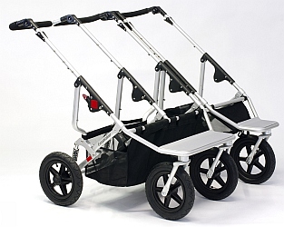 Easywalker Triple, resp. kočárek pro trojčata je sportovní kočárek odvozený od sourozeneckého dvojkočárku Easywalker Duo, ale se třemi plnohodnotnými sportovními sedačkami vedle sebe. Navzdory odlehčené konstrukci z tvrzeného hliníku (duralu) je třeba počítat s vysokou váhou a šířkou, která se nevejde do klasických 80cm dveří. Odpružení šesti stejně velkých nafukovacích koleček dokážeš podle náročnosti terénu regulovat. Pod každou sedačkou se nachází jeden nákupní košík. Odkládací prostor košíků doplňují velké kapsy na zadní části zádových opěrek.