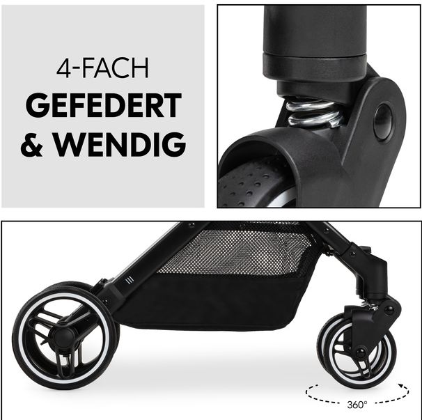 kolečka otočná s možností fixace • téměř úplný rovný leh (165°) • velmi lehký • velmi skladný • složení jednou rukou • skládací vanička • možnost připojení autosedačky • zadní kolečka ⌀17.8 cm • hmotnost kočárku 7.8 kg • nosnost sedačky 22 kg • šířka kočárku 44 cm