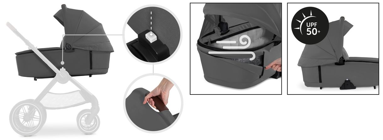 - uzavíratelná ventilační okénka jsou umístěna v prodlužovací XXL stříšce po jejím rozepnutí a na přední straně vaničky (tzv. panoramatické), příjemně tak ovlivňují proudění čerstvého vzduchu,