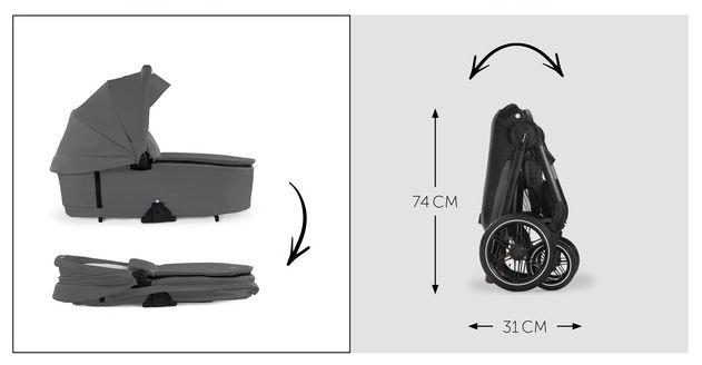 kolečka nenafukovací s výplní (otočná s možností fixace) • úplný rovný leh (180°) • Zádová opěrka jde polohovat do kolmého sedu (90°) • otočná sedačka • velká vanička • velmi skladný • velký úložný prostor • složení jednou rukou • možnost připojení autosedačky • zadní kolečka ⌀30 cm • hmotnost kočárku 11.5 kg • nosnost sedačky 22 kg • šířka kočárku 53 cm