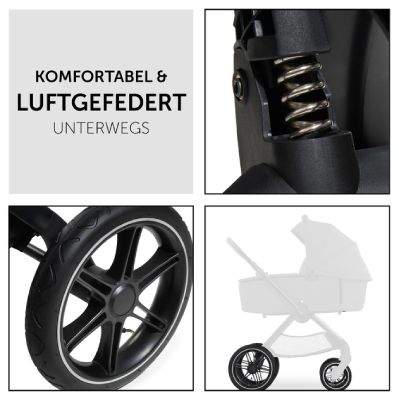 kolečka nafukovací (otočná s možností fixace) • vhodný pro vysoké rodiče • téměř úplný rovný leh (165°) • otočná sedačka • velká vanička • velmi skladný • složení jednou rukou • skládací vanička • možnost připojení autosedačky • zadní kolečka ⌀30.5 cm • hmotnost kočárku 11.55 kg • nosnost sedačky 22 kg • šířka kočárku 60 cm