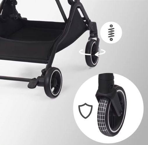 kolečka otočná s možností fixace • • velmi lehký • velmi skladný • zadní kolečka ⌀14 cm • hmotnost kočárku 7.3 kg • nosnost sedačky 15 kg