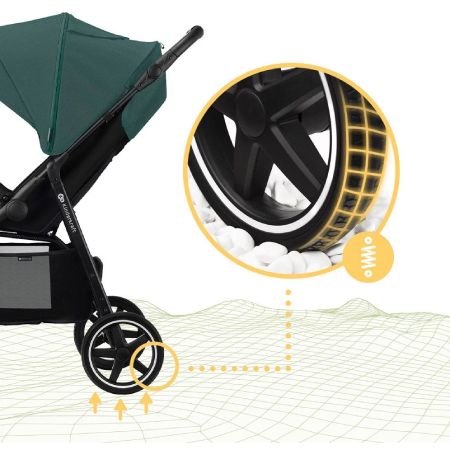 kolečka nenafukovací s výplní (otočná s možností fixace) • téměř úplný rovný leh (165°) • otočná sedačka • velký úložný prostor • skládací vanička • možnost připojení autosedačky • zadní kolečka ⌀23 cm • hmotnost kočárku 11 kg • nosnost sedačky 22 kg • šířka kočárku 55.5 cm