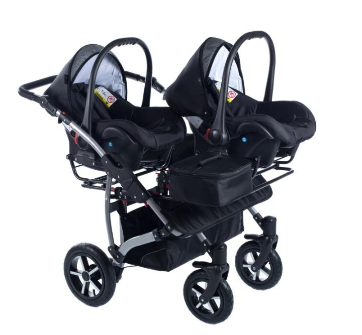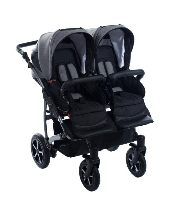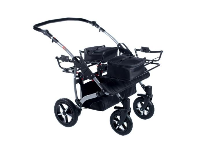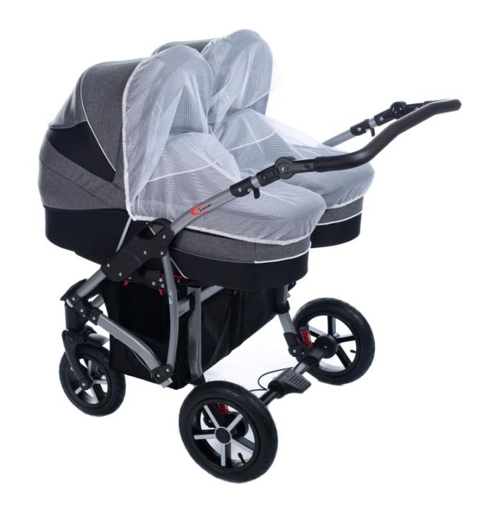 Zakoupíš ho v trojkombinaci, takže je nejvhodnější pro dvě děti již od narození. Novorozencům poslouží dvě hluboké vaničky s polohováním anebo dvě autosedačky se speciálním adaptérem, jehož součástí jsou také dva extra košíky s uzavíracím poklopem. Starší děti umístíš do plně polohovatelných sportovních sedadel. Jejich součástí jsou i polstrované podložky. Všechny nástavby jsou navíc stejné - plnohodnotné pro obě děti, a lze je na konstrukci nasadit v obou směrech. K trojkombinaci patří také doplňková výbava: pláštěnka, moskytiéra, nánožníky a přebalovací taška.
