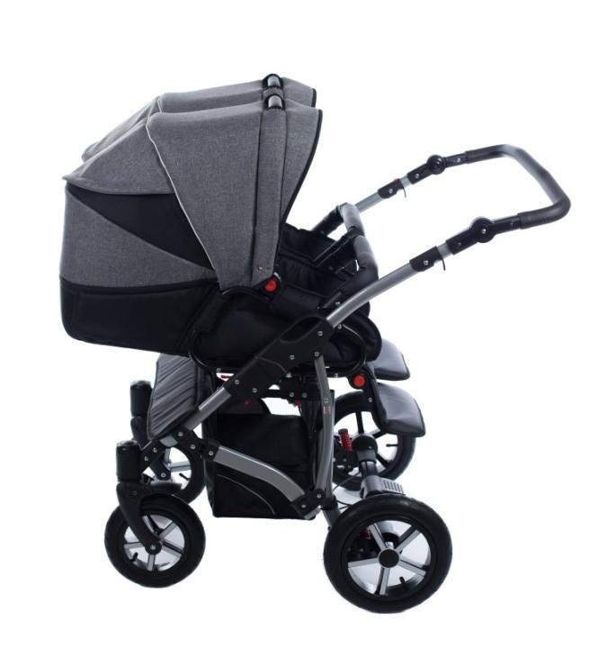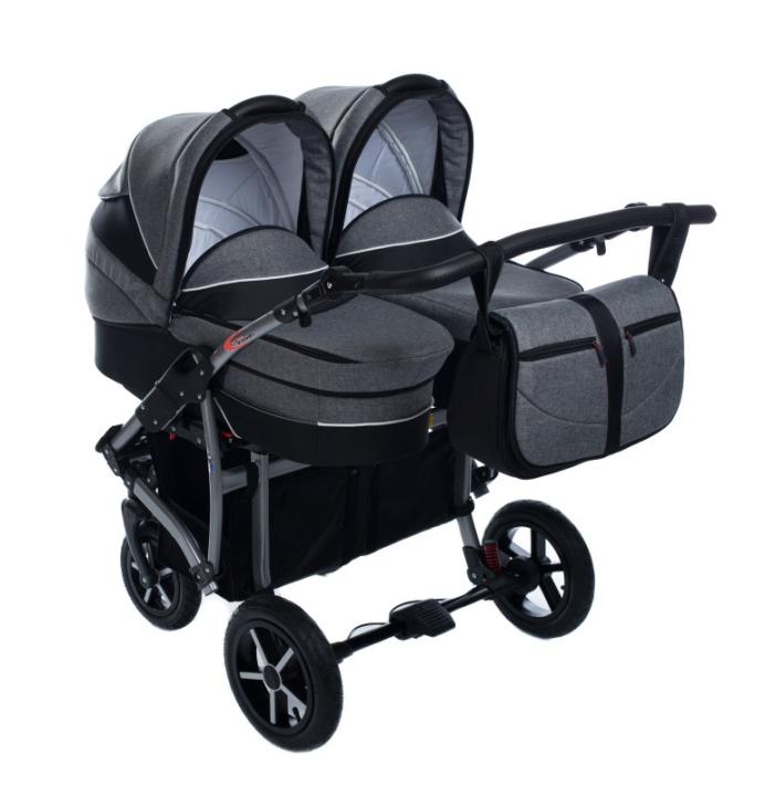 MamaKiddies Twin je kombinovaný kočárek pro méně náročné rodiče dvojčat, případně též věkově blízkých sourozenců. Robustní, široká konstrukce se jen tak tak vejde do klasických 80cm dveří. Je vybavena nafukovacími koly a nastavitelným odpružením, díky kterému se Twin výborně hodí například na vesnici nebo do náročnějšího terénu.