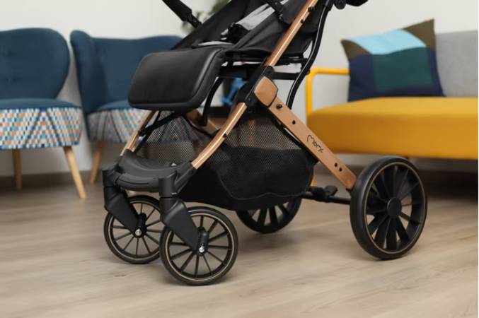 - Ke kočárku patří základní příslušenství v podobě pláštěnky, moskytiéry a nánožníku.
