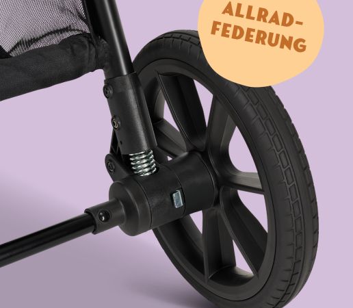 kolečka otočná s možností fixace • téměř úplný rovný leh (165°) • otočná sedačka • velmi skladný • velký úložný prostor • možnost připojení autosedačky • zadní kolečka ⌀29 cm • hmotnost kočárku 13.9 kg • nosnost sedačky 15 kg • šířka kočárku 59 cm