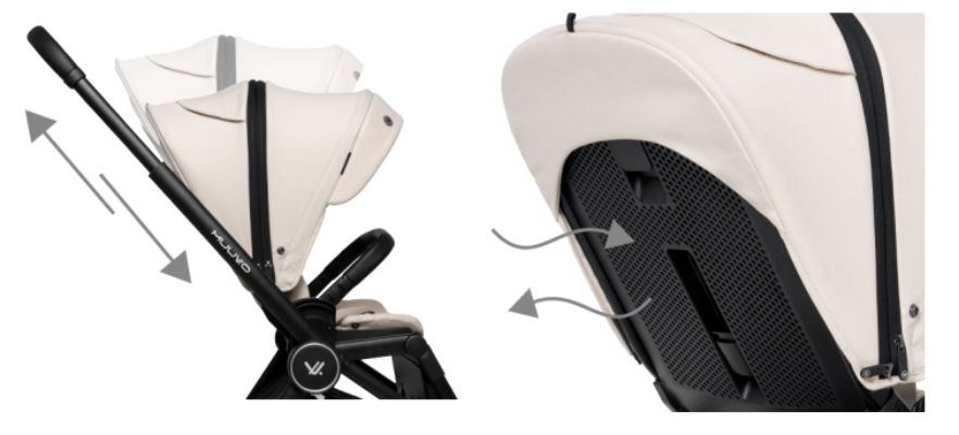 - uzavíratelná 3 ventilační okénka jsou umístěna v prodlužovací XXL stříšce po jejím rozepnutí a na přední a zadní straně hluboké korby (tzv. panoramatické), příjemně tak ovlivňují proudění čerstvého vzduchu,