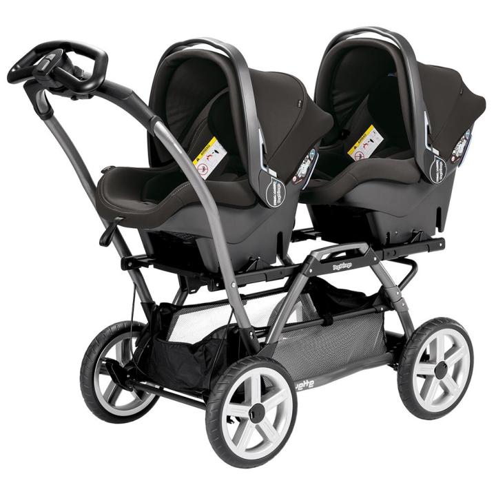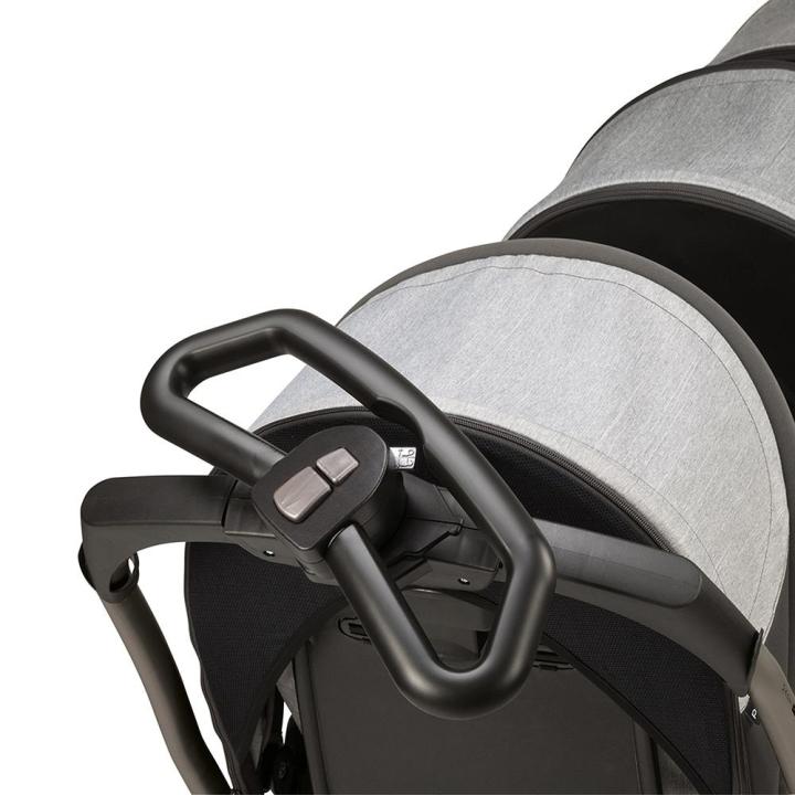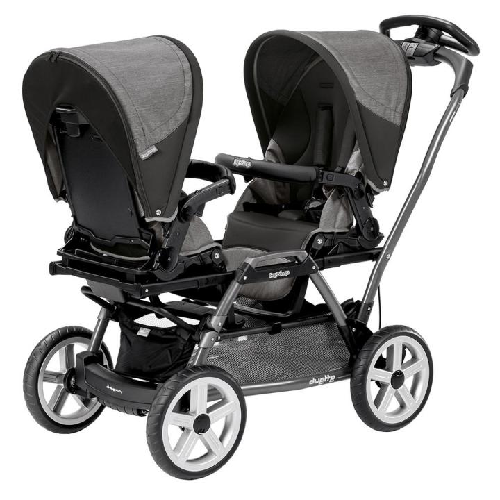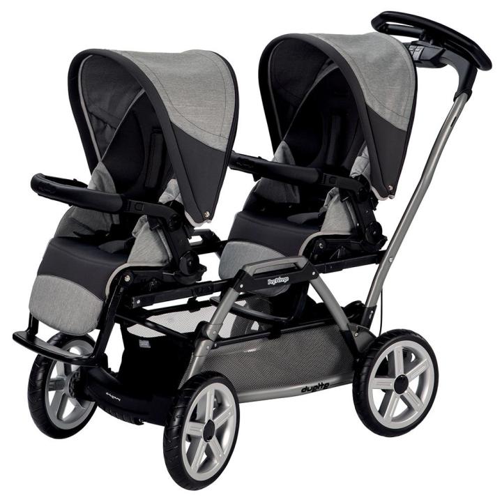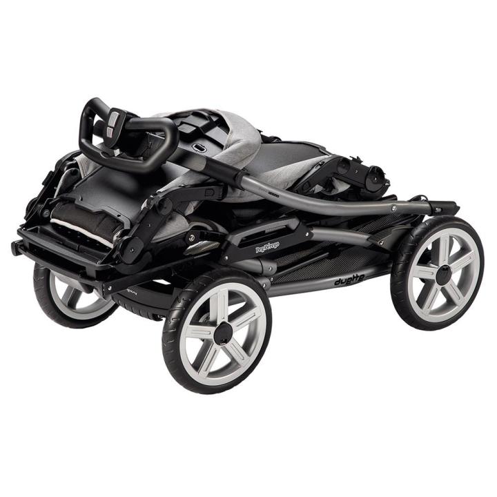 Peg-Pérego Duette s přívlastkem Pop Up je verzí tandemu Duette SW s novými, moderními, skládacími sedadly Pop Up s klasickými pásy. Sedadla můžeš polohovat až do lehu včetně opěrky nožiček. Kratší stříška s úchytem na hračku se dá prodloužit dalším dílem, ale taky použít ve formě štítu proti slunci. Dlouhou konstrukci se zadním odpružením dokážeš poskládat až po odnětí nástavby a vejde se pouze do větších kufrů aut. Velmi prostorný nákupní košík je hůře přístupný. Velká kola jsou vhodná i na zhoršený terén. Jsou otočná, ale namísto volného otáčení jsou propojena s volantem na rukojeti, kterým při jízdě udáváš směr. Otáčení je limitováno - není možné je otočit zcela do kruhu. Volant dokážeš výškově nastavit naklopením. Je na něm umístěn i mechanismus aretace kol, kterým se dá otáčení kol zabránit. Na konstrukci lze nakliknout dvě autosedačky Primo Viaggio, dvě sportovní nástavby v jakémkoliv směru či kombinaci sportovní nástavby a autosedačky nebo hluboké vaničky Navetta XL pro případ novorozence a staršího sourozence. Pro dvojčata od narození je nutné použít kočárek se sportovními částmi zkombinovanými s vložnými taškami či s autosedačkami, dvě hluboké vaničky se na konstrukci najednou nevejdou.