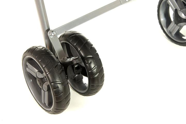 kolečka pěnová (otočná s možností fixace) • vhodný pro nízké rodiče • • velmi lehký • zadní kolečka ⌀12.7 cm • hmotnost kočárku 5.8 kg • nosnost sedačky 15 kg • šířka kočárku 46.5 cm