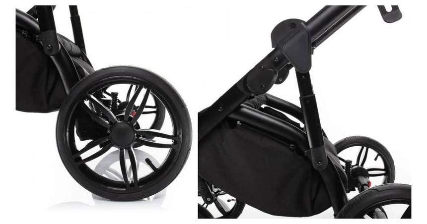 kolečka nafukovací (otočná s možností fixace) • vhodný pro vysoké rodiče • téměř úplný rovný leh (165°) • otočná sedačka • velká vanička • skládací vanička • možnost připojení autosedačky • zadní kolečka ⌀30 cm • hmotnost kočárku 15 kg • nosnost sedačky 15 kg • šířka kočárku 64 cm