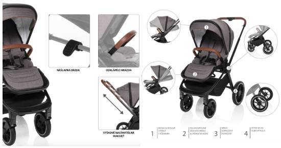 - Volitelné dokoupitelné příslušenství: moskytiéra, skejt, držák na nápoj, fusak, adaptéry na autosedačku atd.