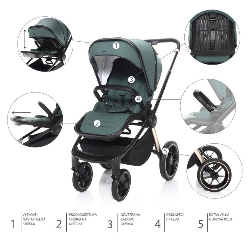 - Volitelně dokoupitelné příslušenství: moskytiéra, skejt, držák na nápoj, fusak, adaptéry na autosedačku atd.