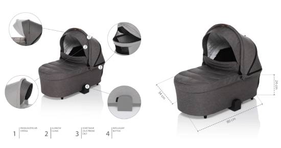 - Volitelné dokoupitelné příslušenství: moskytiéra, skejt, držák na nápoj, fusak, adaptéry na autosedačku atd.