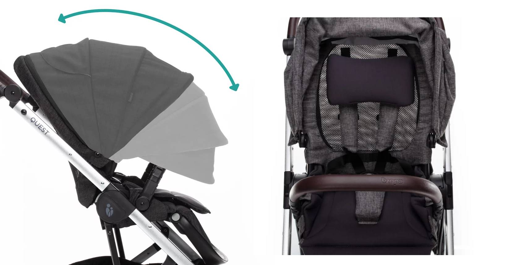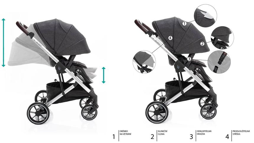 Kočárek Zopa Quest je určený pro nižší a středně vysoké rodiče, kteří se pohybují jak po městském povrchu, tak i po nerovných cestách vesnice. Nižší váha a snadná manipulace umožňují ovládání jednou rukou. Zaujme jednoduchým složením s nasazeným sedadlem na konstrukci v jakémkoliv směru. Není třeba ani hledat místo, kam kočárek opřít, protože ve složeném stavu stojí sám. Prostorné sportovní sezení lze napolohovat do téměř úplného rovného lehu. Navíc je jeho zádová opěrka tvořena pevnou větrací síťkou, ta v horkých letních dnech umožňuje příjemné odvětrávání. V zimních měsících se zádová opěrka zase uzavírá vložkou a zajišťuje tak uvnitř teplo a útulnost.