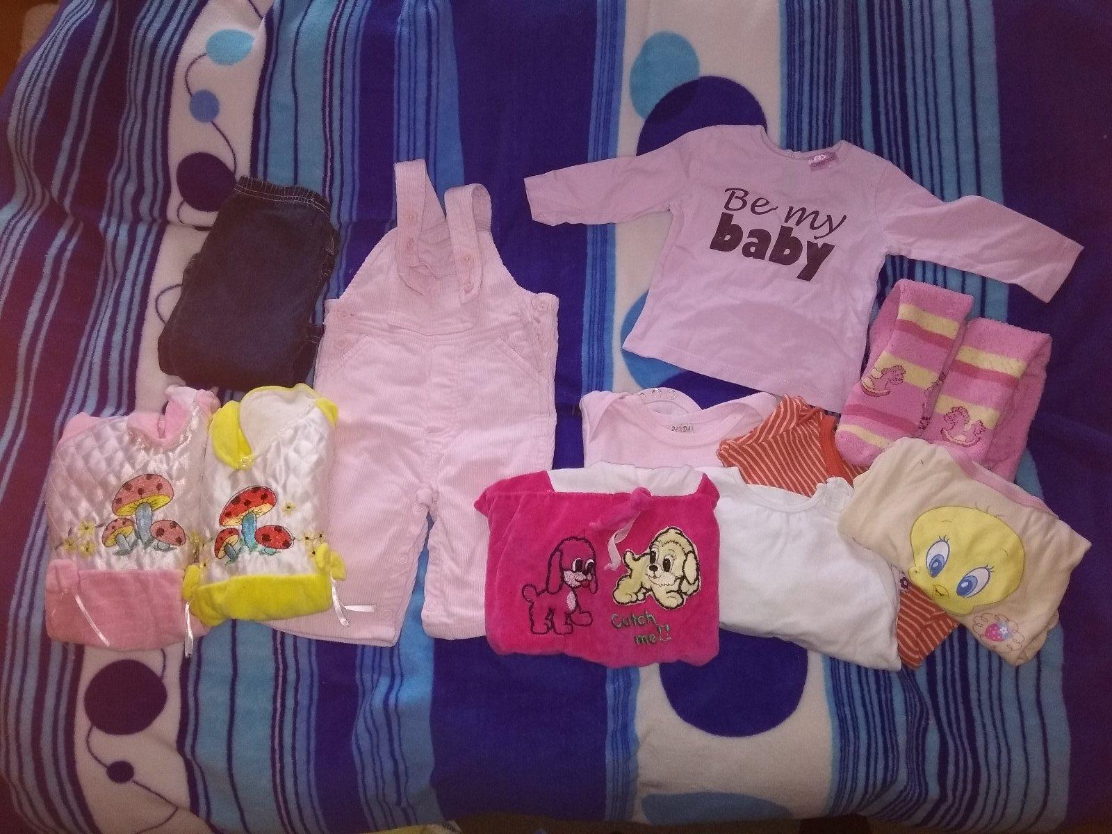 Nabízím 20 kusů oblečení pro holčičku od 6-9 měsíce (vel. 74) ve velmi zachovalém stavu. Balíček zahrnuje mix oblečení jako například body, dupačky, overaly, košile, trika, kalhoty, sukně, šaty apo...