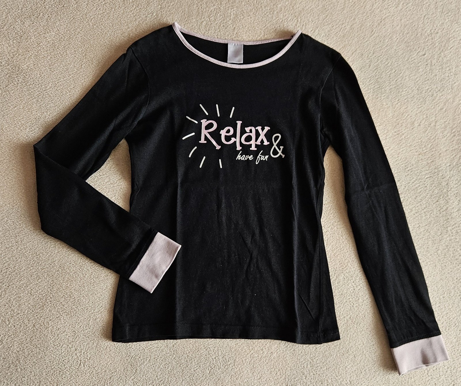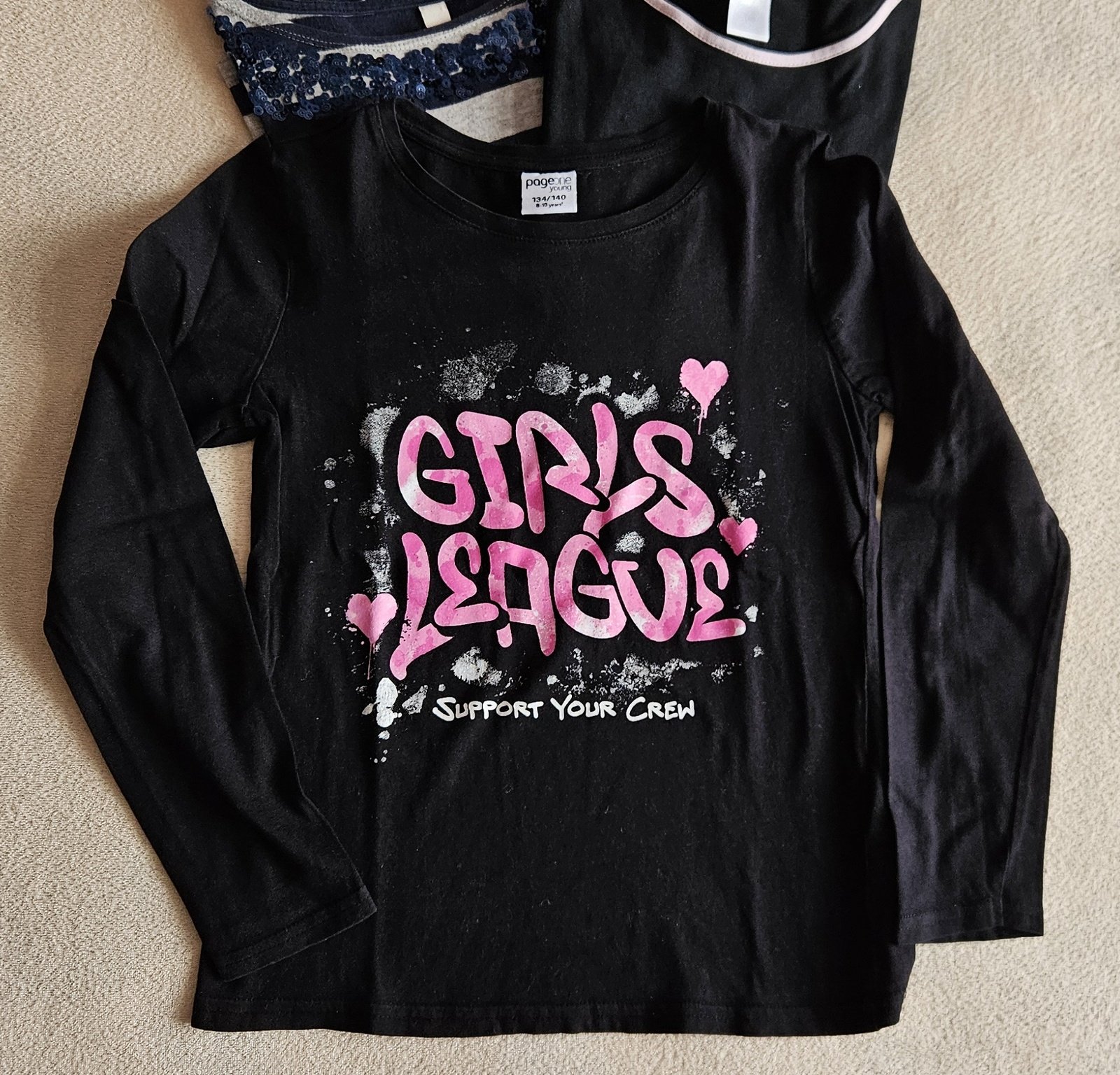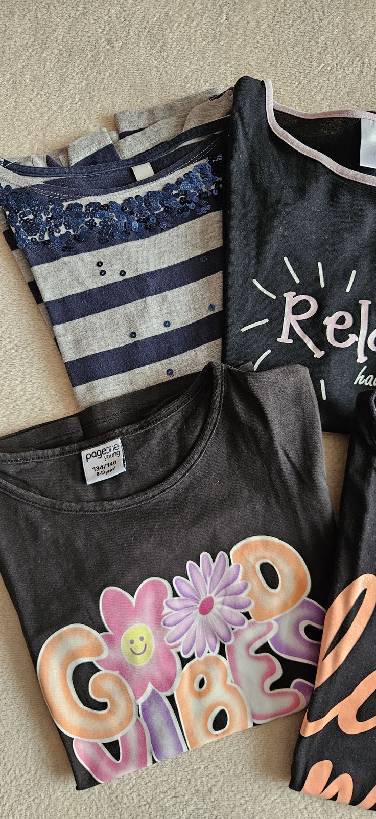 3x dlouhý rukáv, černé s nápisem, vel.134/140, zn.Pageone young, černé Relax, vel.140, šedomodré proužkaté s flitry, ve.140/146, zn.Esprit
