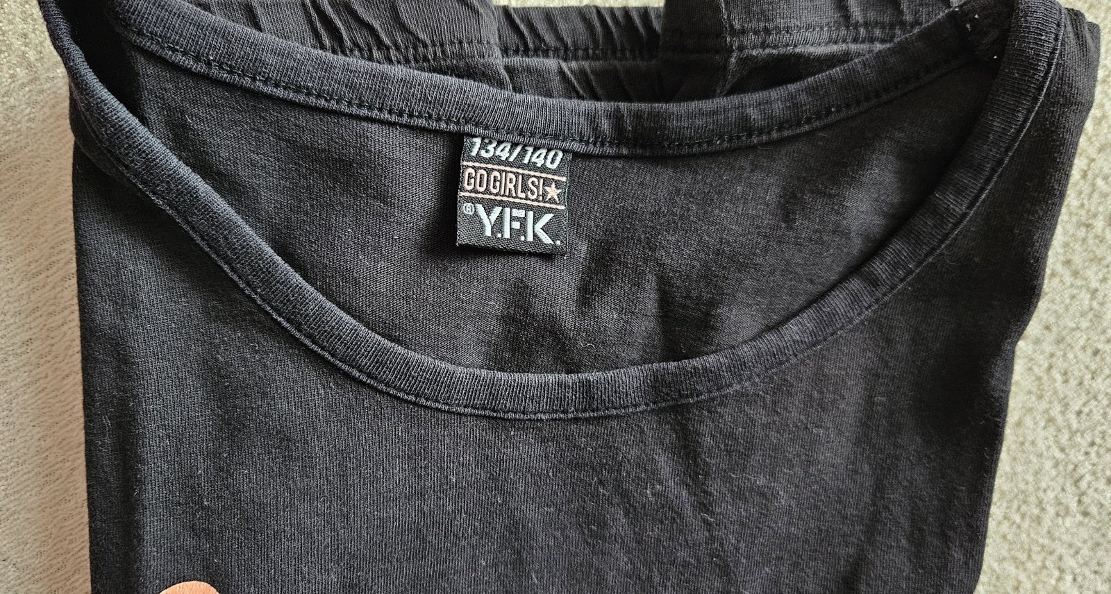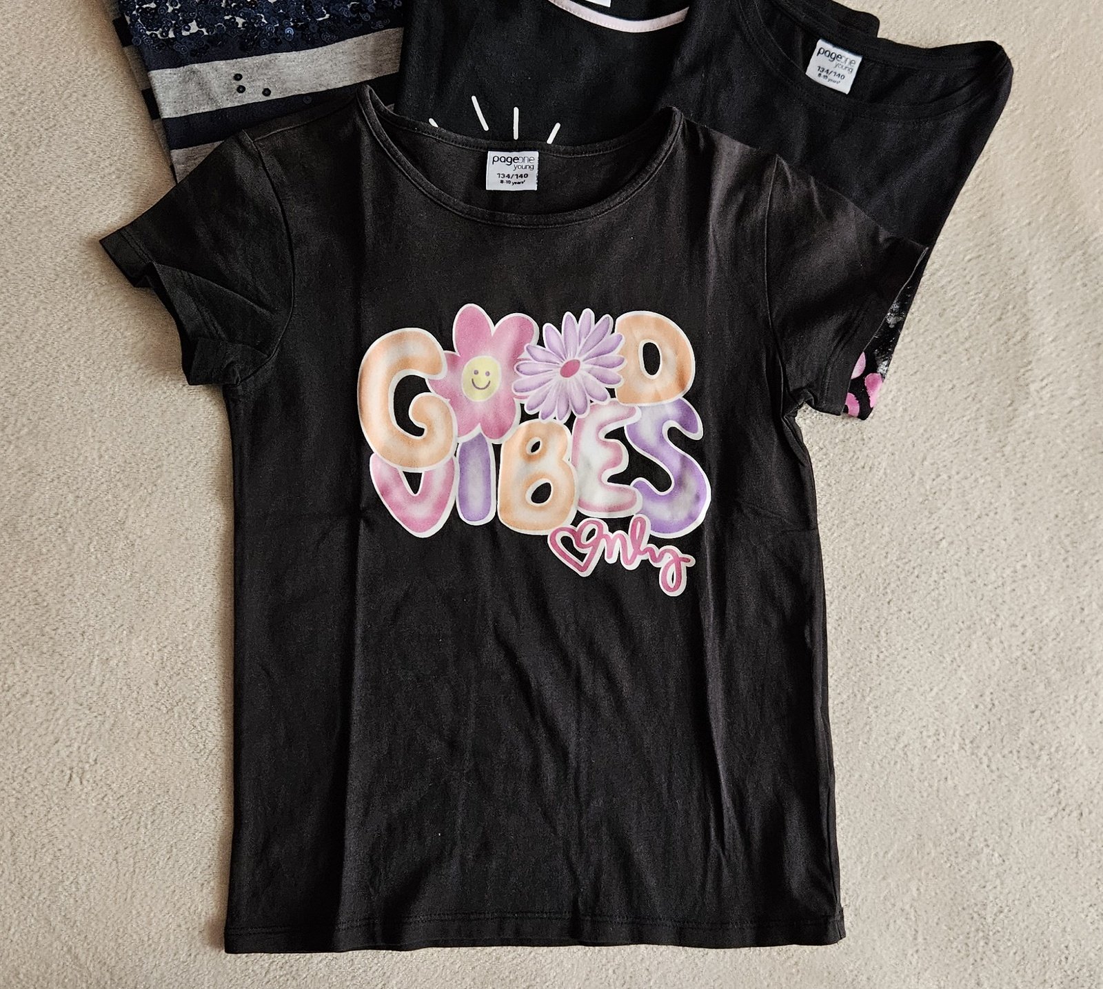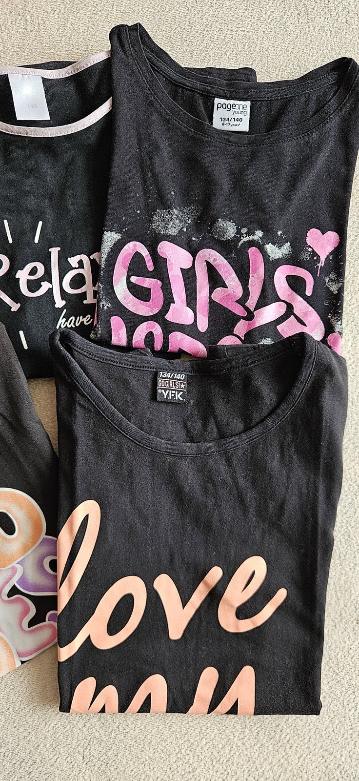 2x krátký rukáv, černé s kytičkou a nápisem, zn.Pageone young, vel.134/1410, černé s nápisem, vel.134/140, zn.Y.F.K