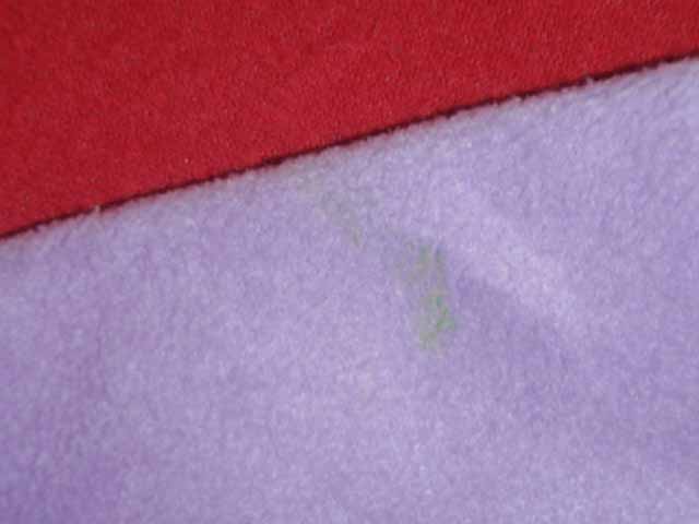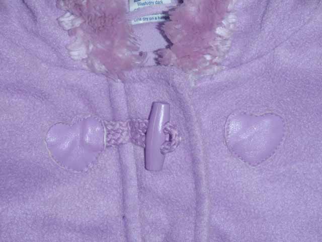 2) fialový kabátek, nošený, malý flíček na rukávu