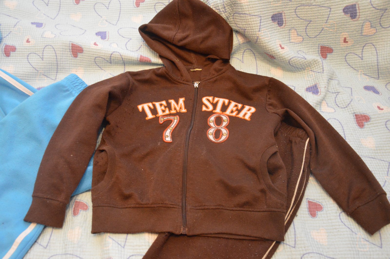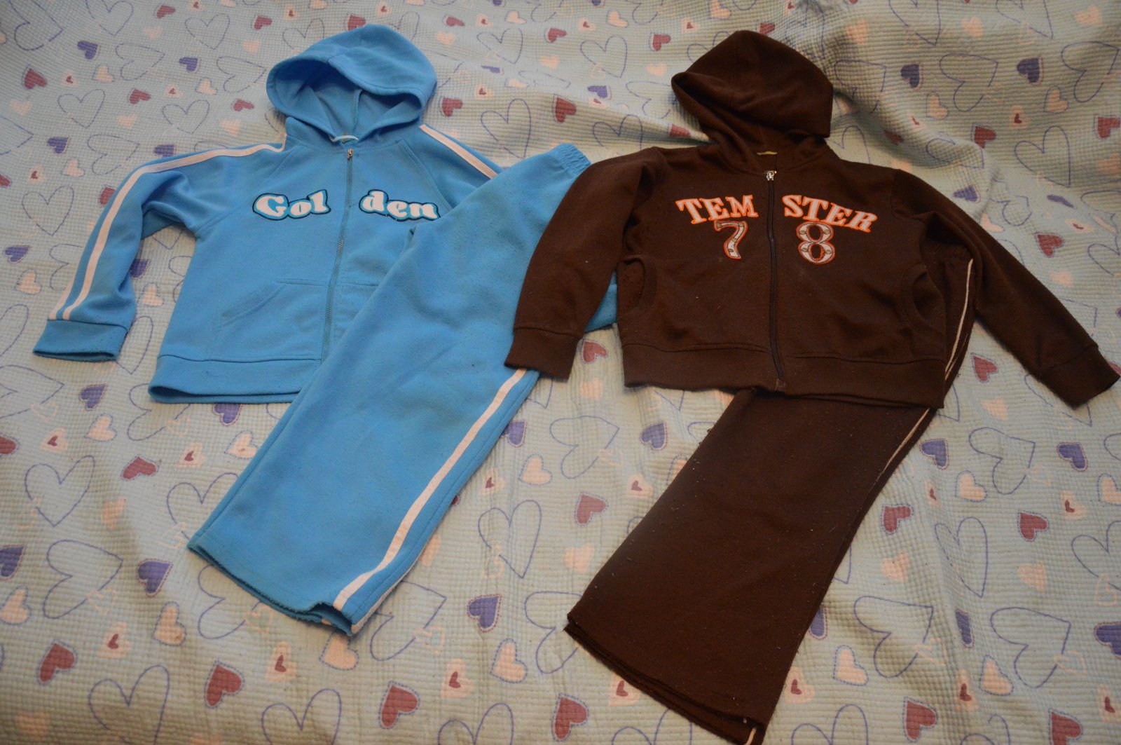 2x teplákovka, tepláková souprava , žmolíky, občas zatrhlá nitka (na lítačku). Uvedena větší velikost, ale nošeno při vel. 116/122, obě stejně velké, nošeno nastejno, cena za obě