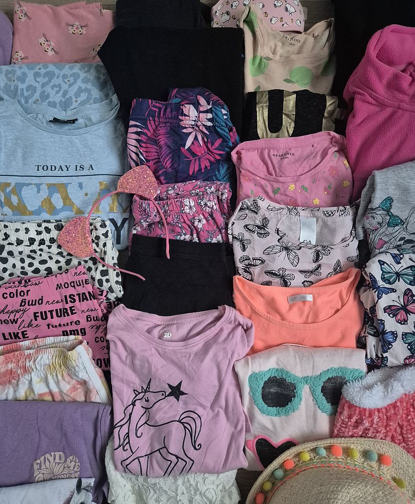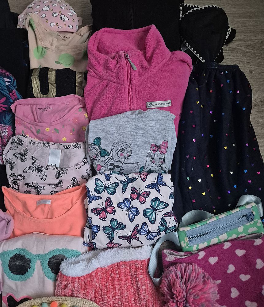 Set obsahuje- triko s hvězdou flitr, super, triko s nápisem bílé, nové, croptop s koníkiem, nové, zelené šaty nenošené, návleky růžové super, klobouk, super, čelenka flitry, super, kulich nošený, chloupek, mikina černá Lotto, skoro nová, noční košilka s Tygříkem, nošená, pěkný stav, triko s moněm, pěkný, pyžamo modré, nošené, pěkné, triko s krajkou, pěkné, podprsenka Snoopy, nenošená, mikina s koněm, pěkná, šaty s motýlky, nošené, pěkné, sukně se srdíčky, více nošená, zezadu oprané hvězdičky, legíny květované, oprané, legíny černé super, teplý nákrčník nenošený, triko s holkami, nošené, ještě v pohodě, kapsička na mobil, nová, fleeska super, triko jednorožec, chloupek, legíny květ pěkné, lyžařské podkolenky více nošené, 2 tenké kukly super, plavky dvojdílné super, růžové tepláky, flíček, tepláky s číslem pěkné, tepláky Snoopy pěkné, legíny modré, chloupek, zateplené legíny nové, leopardí kraťasy oprané, kraťasy s nápisy nové, triko s flitry více nošené, triko s jablky zašívané, triko brýle krítké nové, triko s motýli, více nošené, kraťasy barevné oprané, fialové kraťasy s mikinou super, triko kytičky, pěkné, 4x krátké ponožky více nošené, 2x ponožky pěkné, nákrčník flees se srdíčky pěkný, tenká čepice Genova nová, triko s čísly oprané.