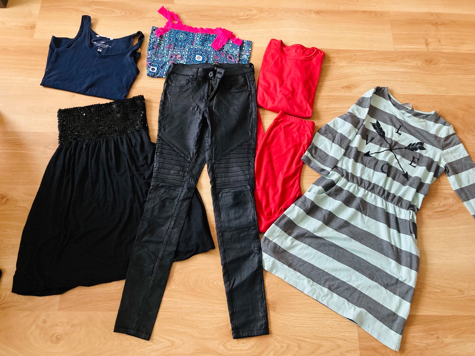 Balíček věci po dceři vel. 158/XS. Jsou tam 3 mikiny( zelená už není), dvoje nenošené 3/4 kalhoty SAM 73 a Lindex/vel.170/, 5 tílek, 1tričko s širokým rukávem a dvoje kraťasy. Prodám pouze dohromad...