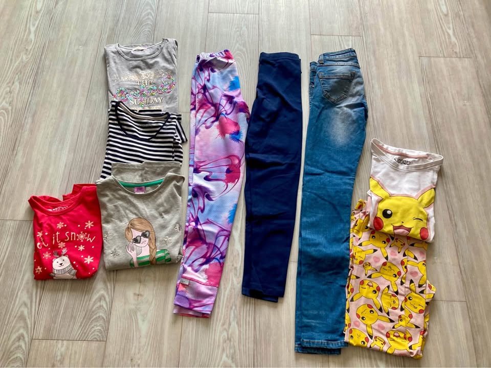 Mix oblečení vel. 140-146. Černé rifle od rozkroku 64cm, v pase mnou všitá guma - lze odpárat. Růžové kalhoty od rozkroku 67cm, tepláky od rozkroku 59cm, ošoupaná kolena, tmavě modré 3/4 legíny, na...