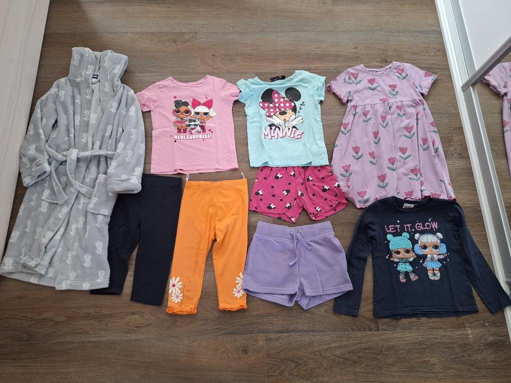 1x pyžamo (Lidl), 1x župan (Lidl), 1x šaty (Next), 2x krátké legíny (3/4 délka, CA a Lidl), 1x kraťásky (Lidl), 1x tričko s dl. rukávem a 1x tričko s kr. rukávem.