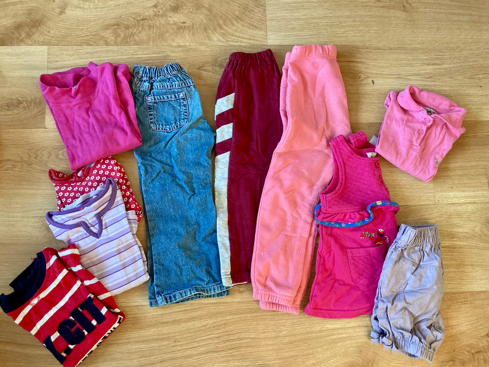 Nošeno, dobrý stav, tílko Next, kraťásky riflové Vinyl Fraise, žebrované růžové tílko Girl2girl, ve vel. 4-5 let, fialové kraťásky a tílečko s proužky, šatky Logg trochu opraná barva vel. 110-116 a...