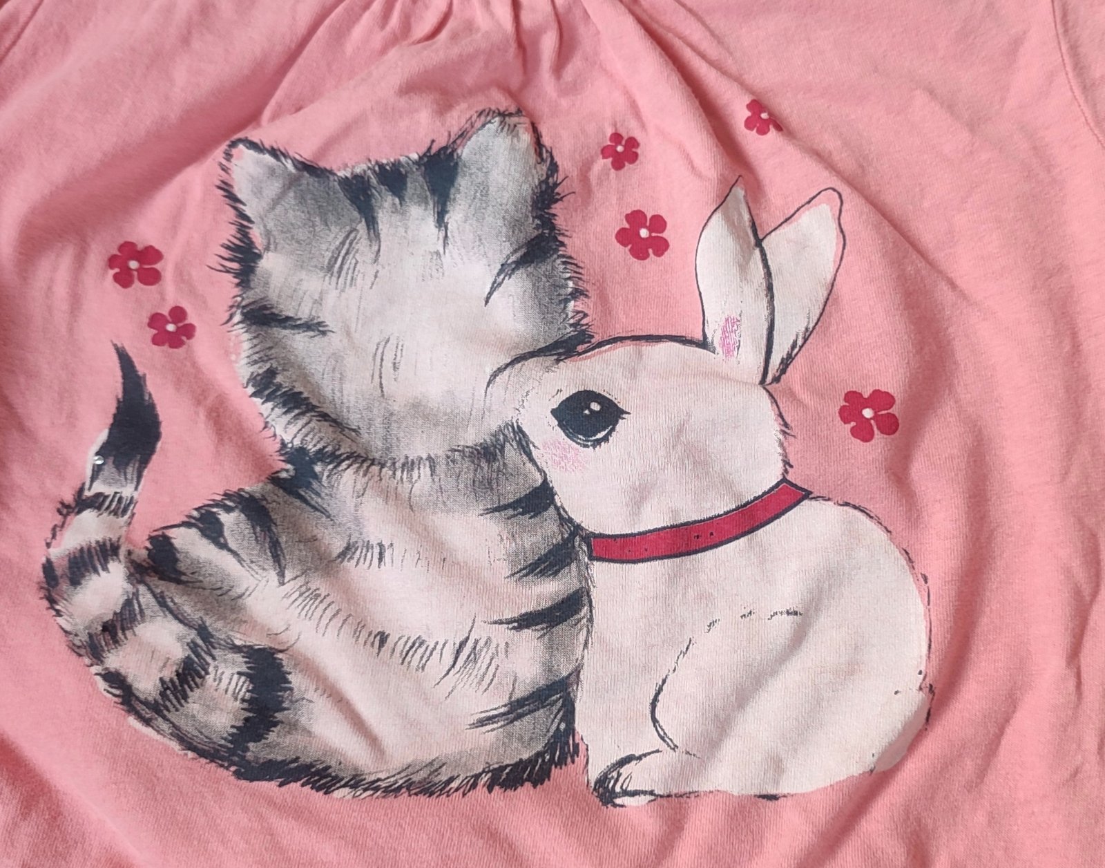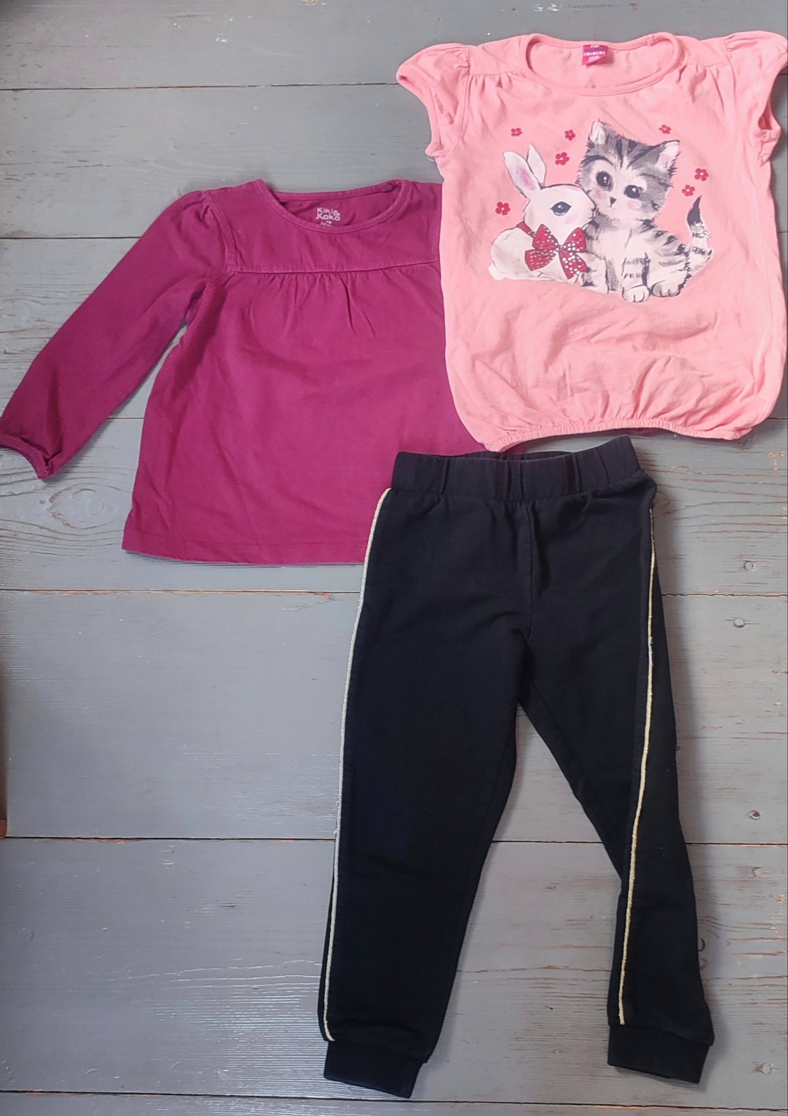 Nošené, zachovalé, trika pěkné, jen na Kitty malý flíček, na riflích dole drobné odření, nic hrozného, vše vel. 5-6 let, cena celkem. mix značek Next, Logg, Okay, Dopodopo