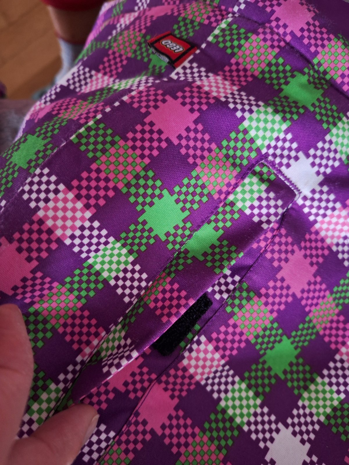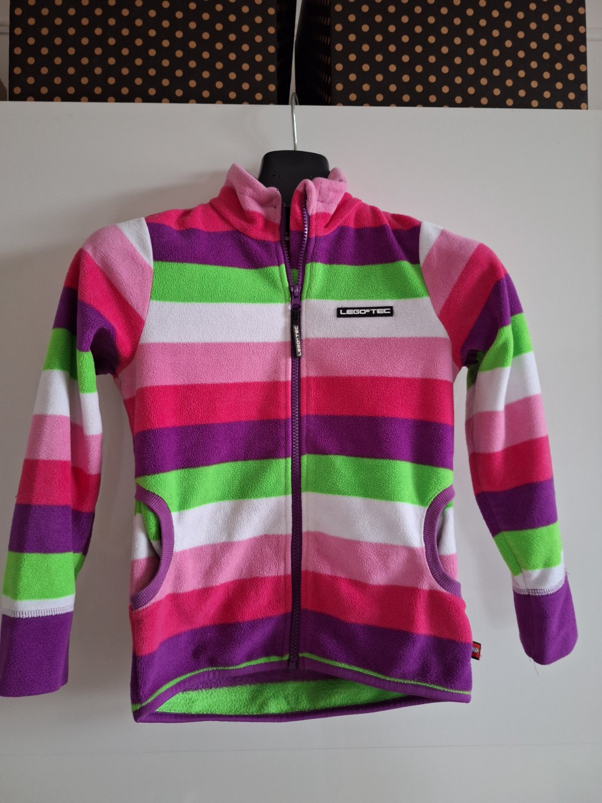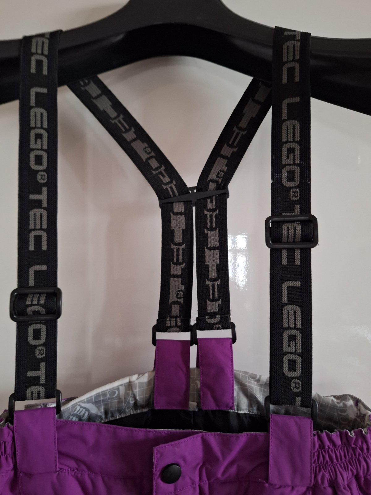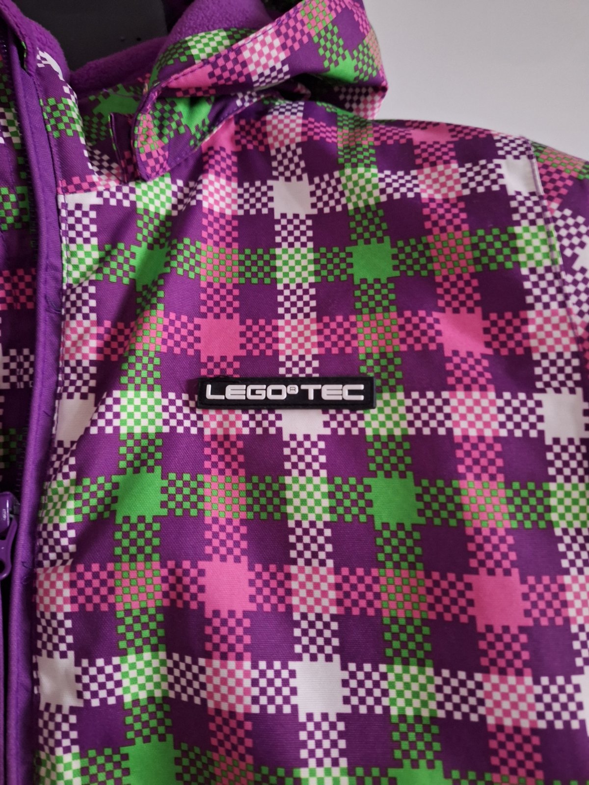 Bunda, lyžařské kalhoty, pruhovaná mikina a čepice značky Lego.