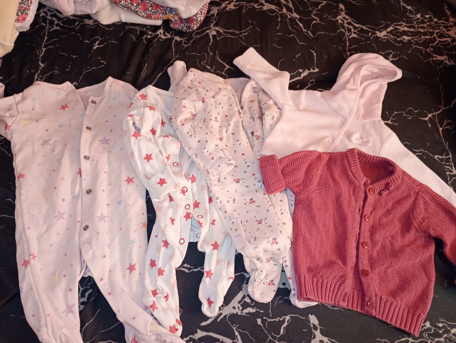 Nošené, pěkné, jen overálek mírně známky praní a zašitá dírečka za krkem, vel. 62. Bodynka, mikinky sametové, fialová a zavinovací růžová, dupačky Kay vel. uvedena 68, jsou menší, délka po patičku ...