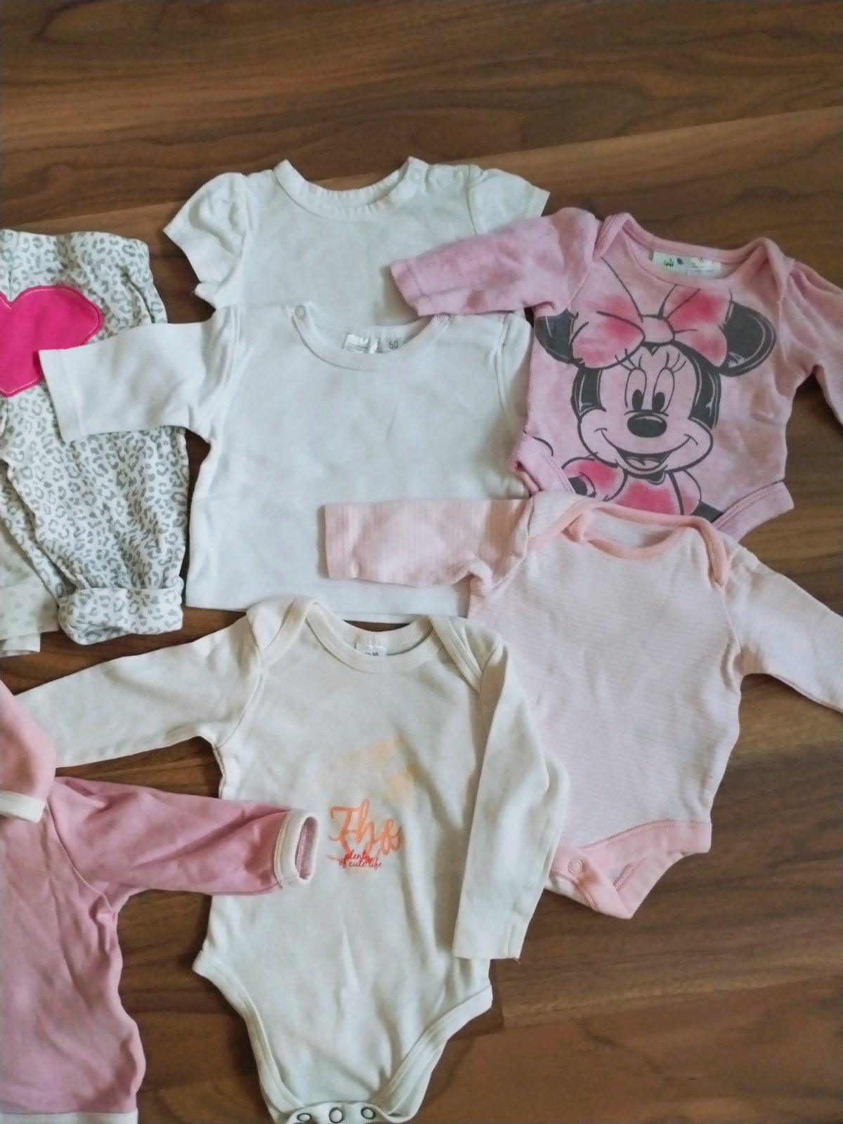 Pěkné oblečení pro holčičku miminko vel.50/56. Body dlouhý rukáv 3x, čepička 2x , tričko dlouhý rukáv, tričko krátký rukáv, mikinka, 7 x legíny,1x polodupačky