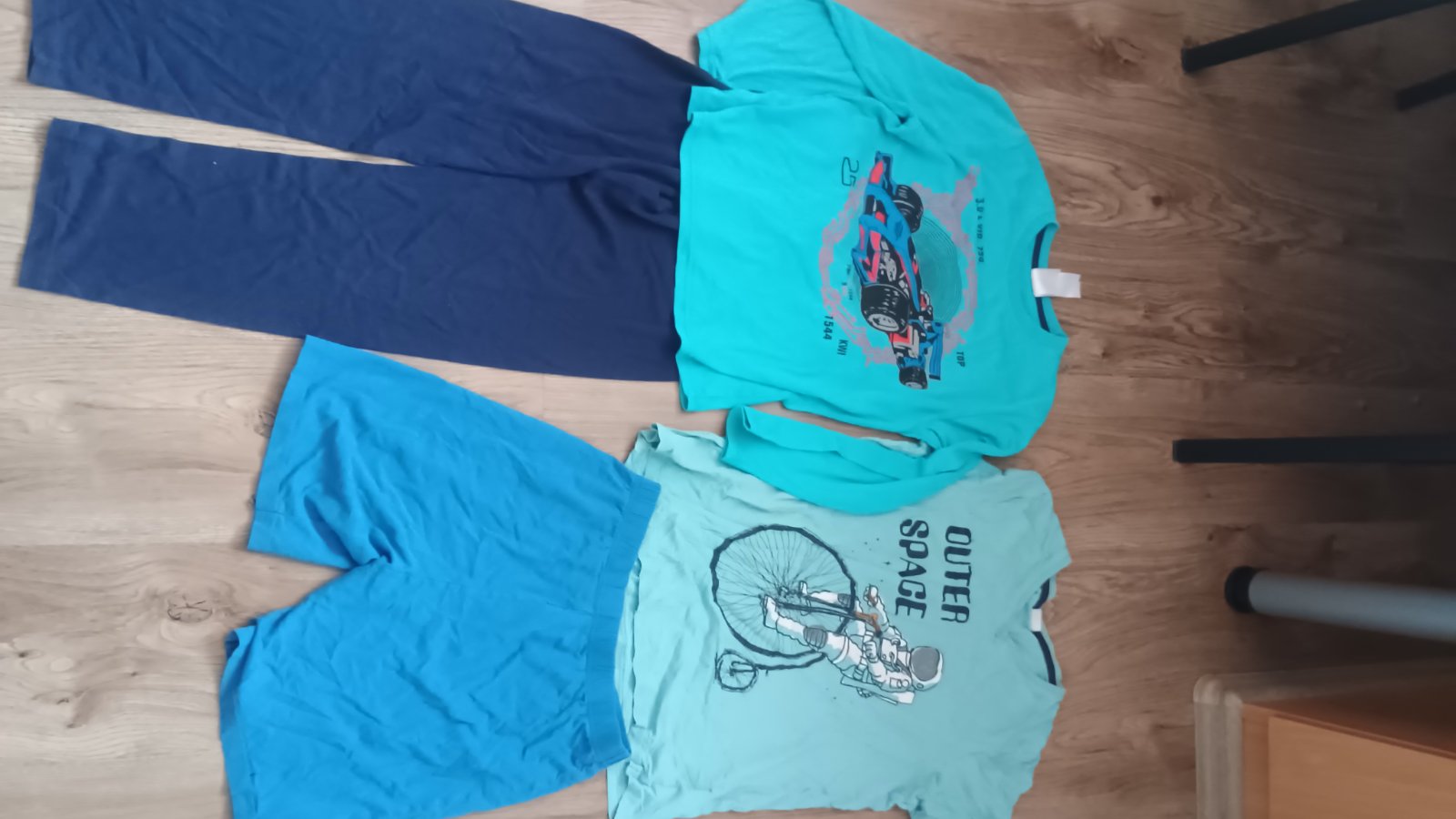 Tričko je dlouhé od ramene 57cm, šíře mezi průramky 2x40cm, vel. 146/152 # kraťasy ze silnější teplákoviny v pase 2x34 cm (natahnou se až na 38cm), délka 45cm, vel. 152# fosforové kraťasy jsou na p...