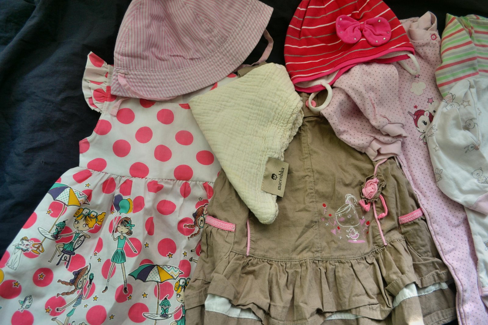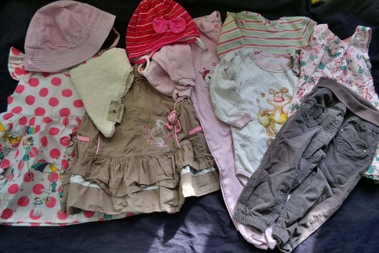 10x dívčí oblečení na 9-12 měs. léto/podzim, krásné moderní šaty, klobouček,kalhoty,body,overal na spaní..,dobrý stav, cena za vše celkem