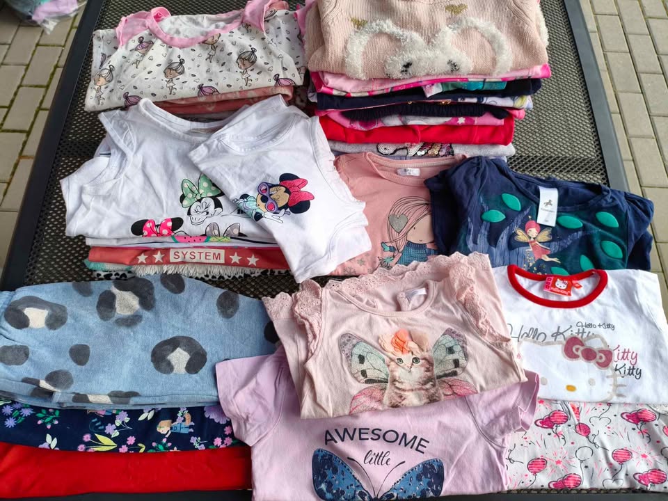Kolem 16ks trik většina kr.rukav nebo bez,asi 3 mají dl.rukavek,2x tepláky,2x legíny,1x šortky,1x kalhotky na plenky,svetříky teplejší i slabší,mikinka,bavl.sáčko..Domaci fleece spodky od pyžam asi 4ks i vršek.