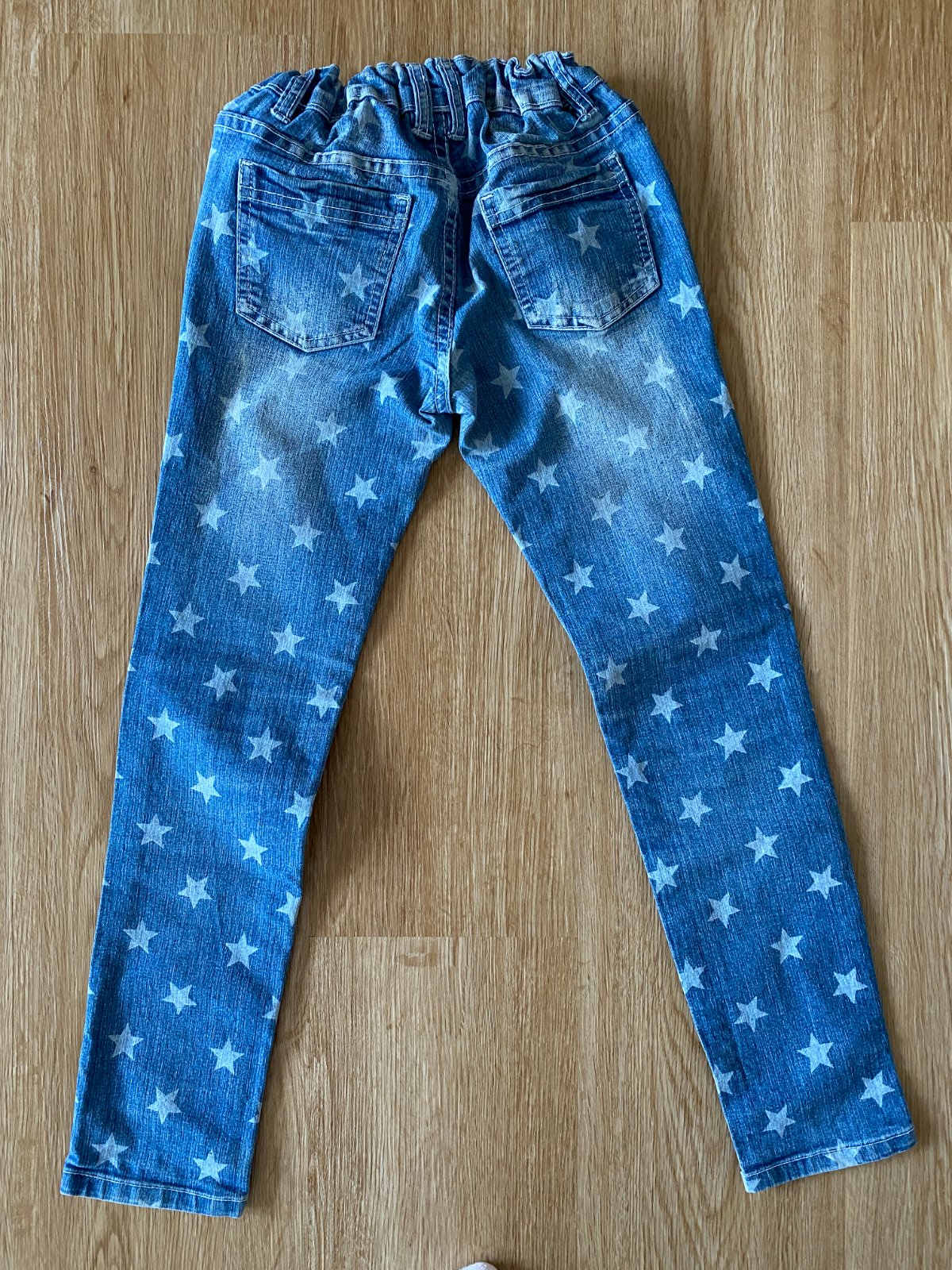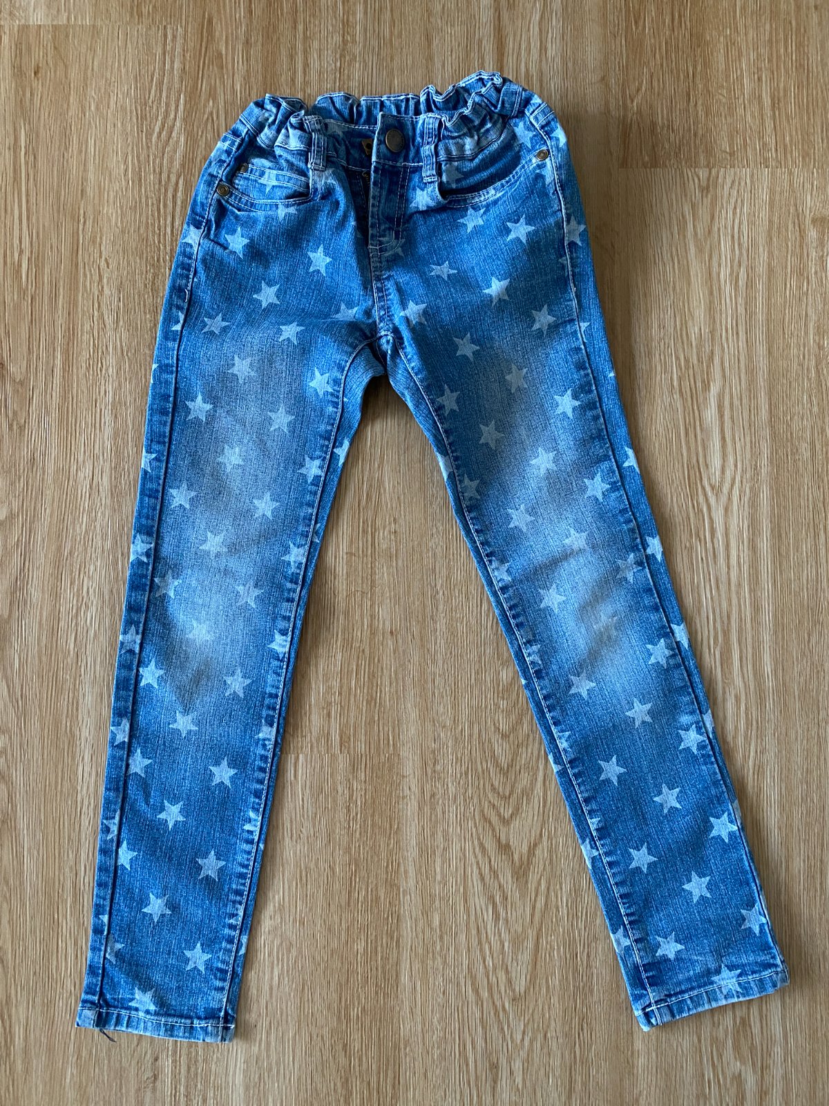 Rifle s hvězdičkami – Y.F.K, vel. 134, lehce šíslá kolena, celková délka 77 cm, rozkroková délka 60 cm