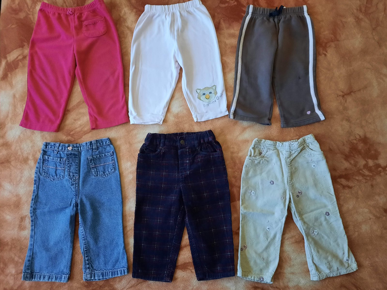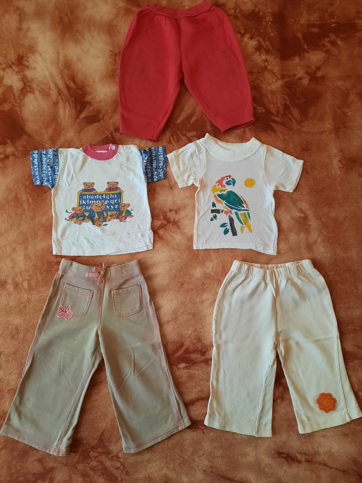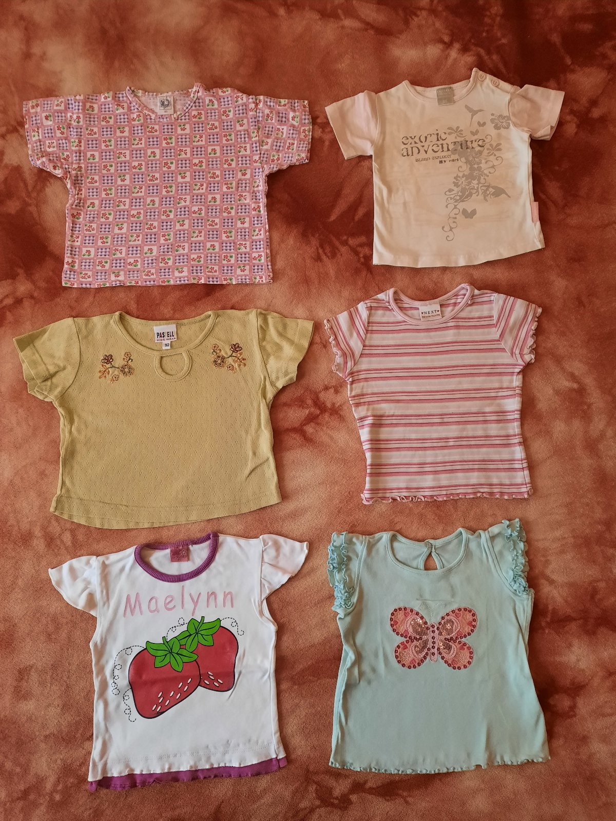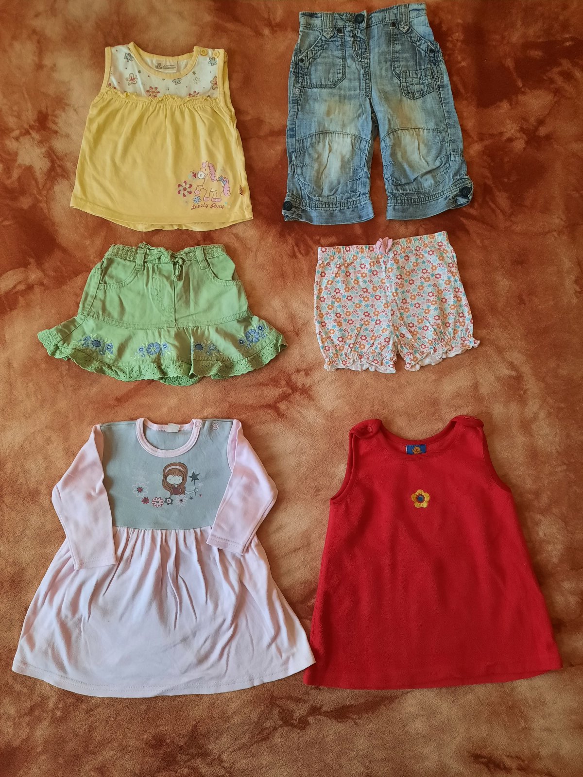 Prodám mix oblečení pro holčičku vel. 86, odpovídá věku 12-18 měsíců, celkem 36 kusů. Většinou se dají nosit dříve, některé vydrží déle. Věci jsou nošené, na žlutém tílku (4. snímek vlevo nahoře) jsem našla flíčky, na hnědých tepláčkách (2. snímek vpravo nahoře) zašitá dírka, červené tepláčky na posledním snímku už jsou na donošení. Jinak dobrý stav. Mix značek Next, George, F&F, Mothercare, Cherokee a další. Růžové šatičky s holčičkou mají uvnitř všitý spodní díl jako bodýčko (nafoceno), moc pěkné.