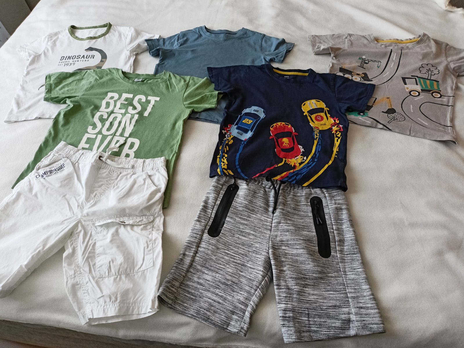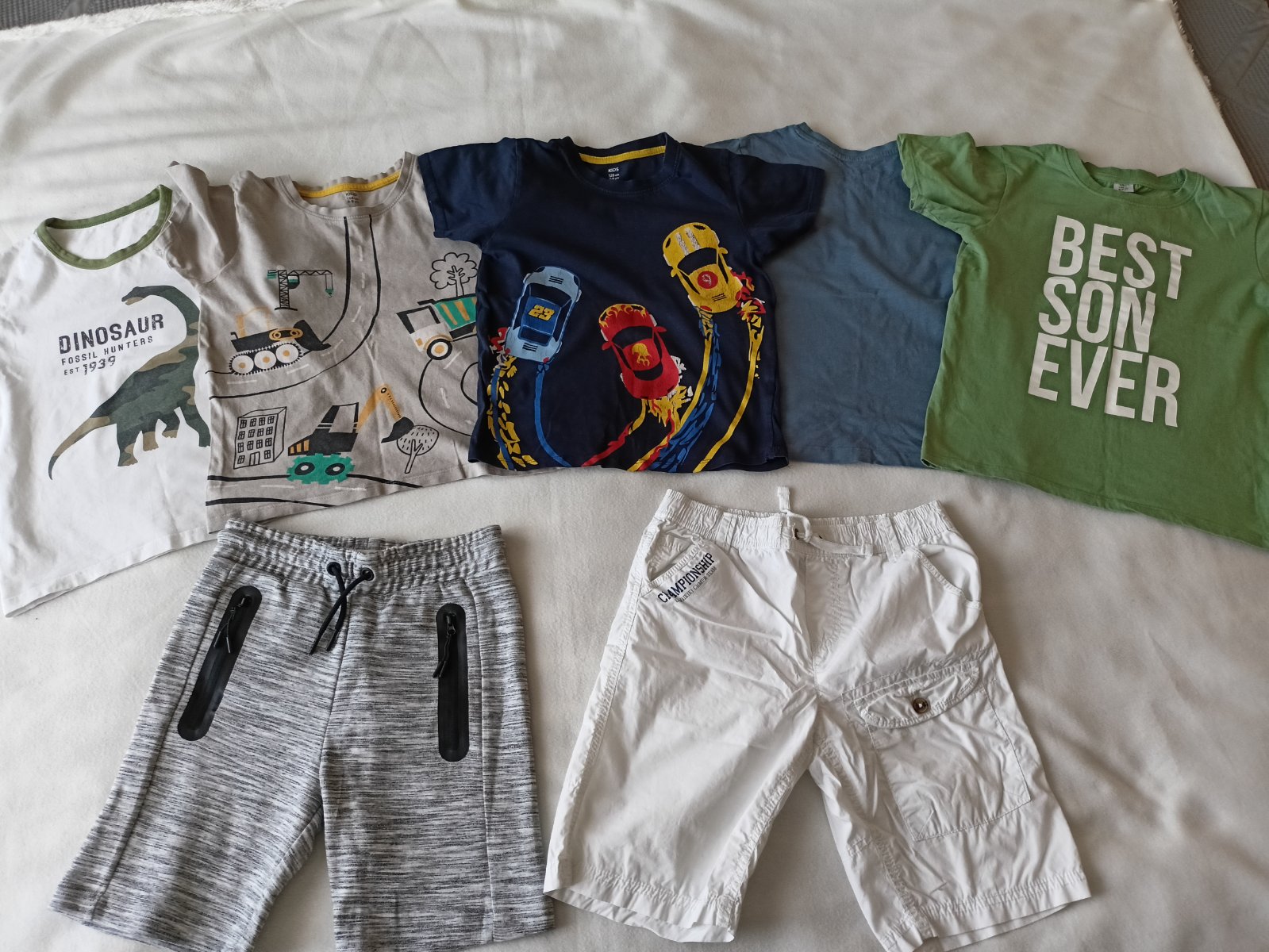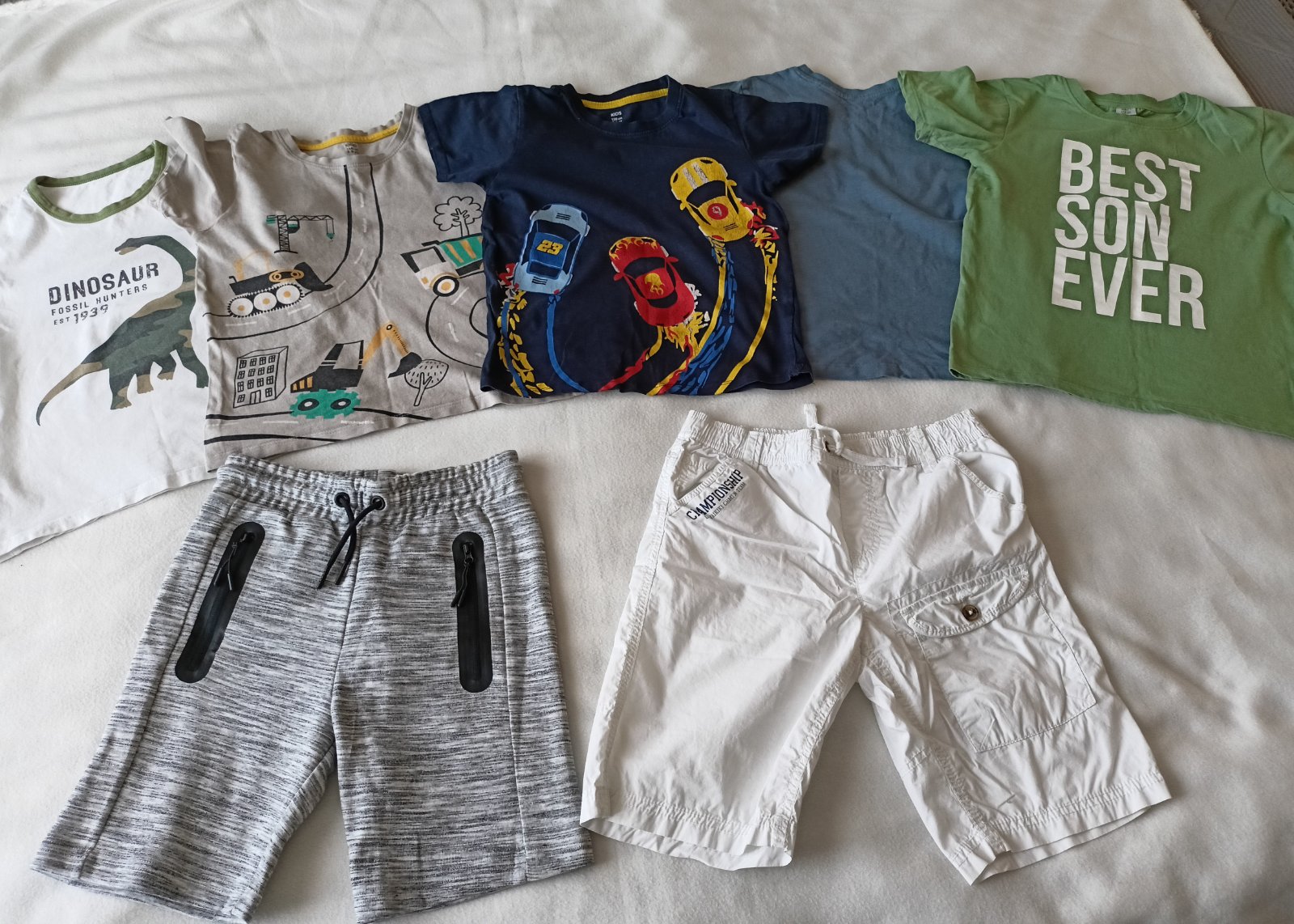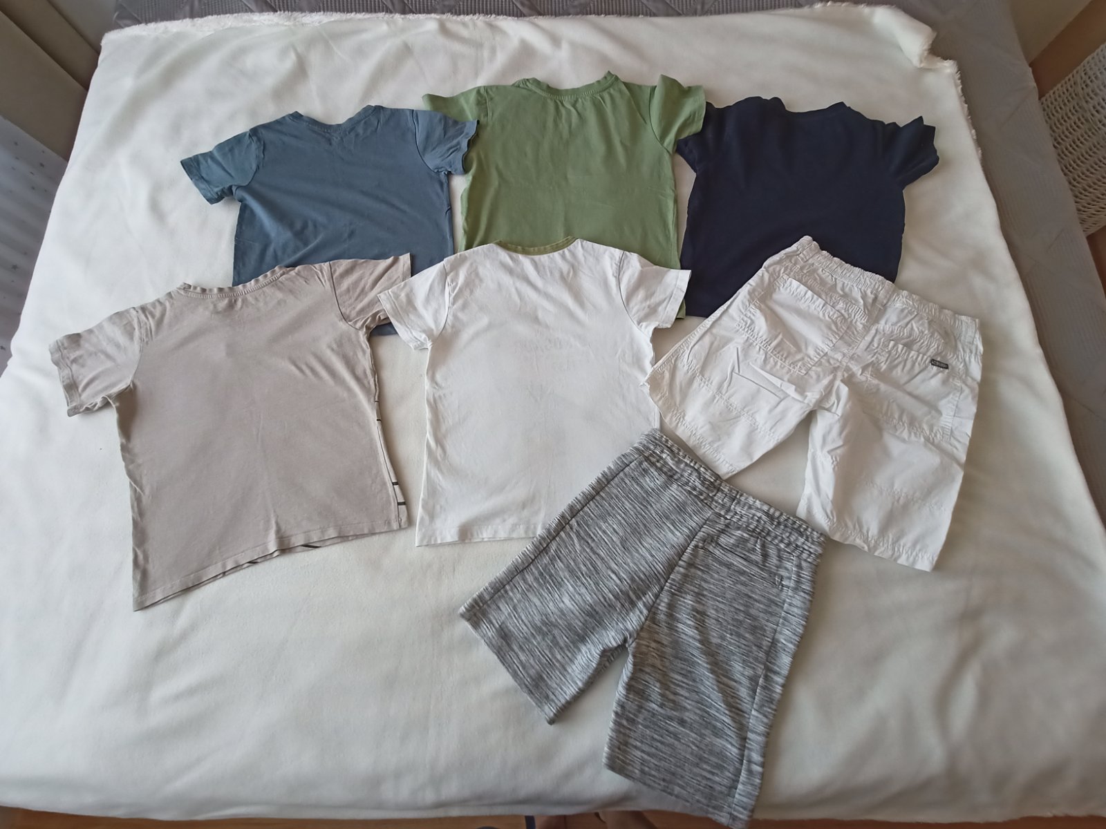 Prodám po synovi 5x letních triček (bavlna) a 2x delší kraťasy. Jedny teplákové v šedé barvě, druhé v bílé. Jsou stylové, bavlněné prodyšné, mají kapsy. Velikost pro chlapce 8-8,5 let (128/134) Vše v dobrém až velmi dobrém stavu.