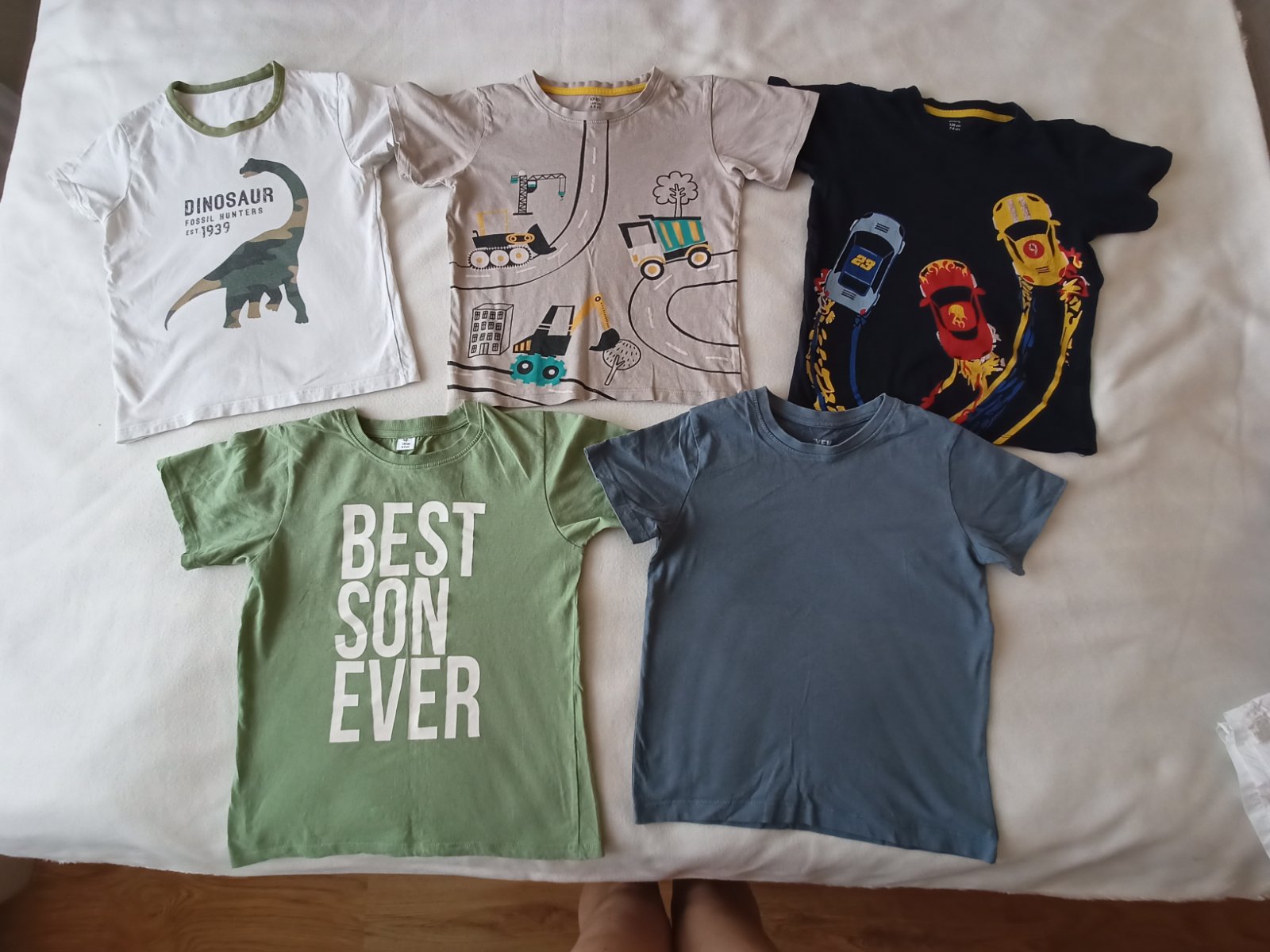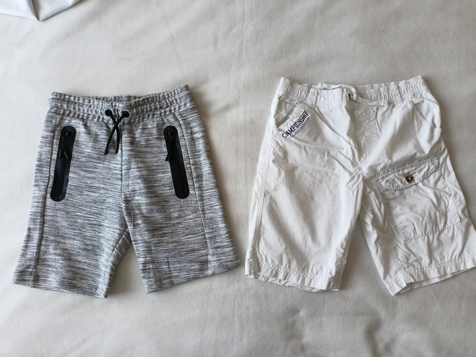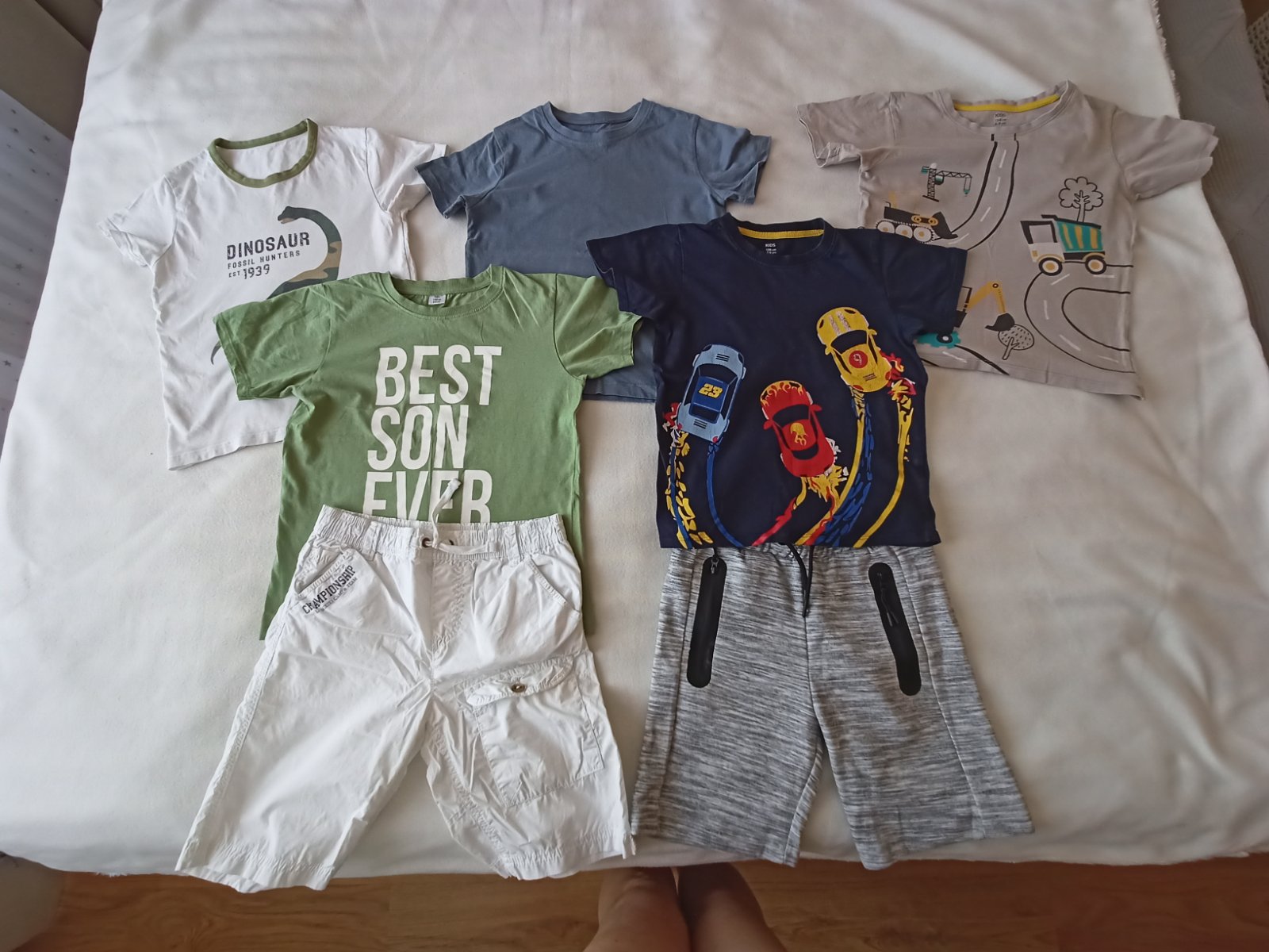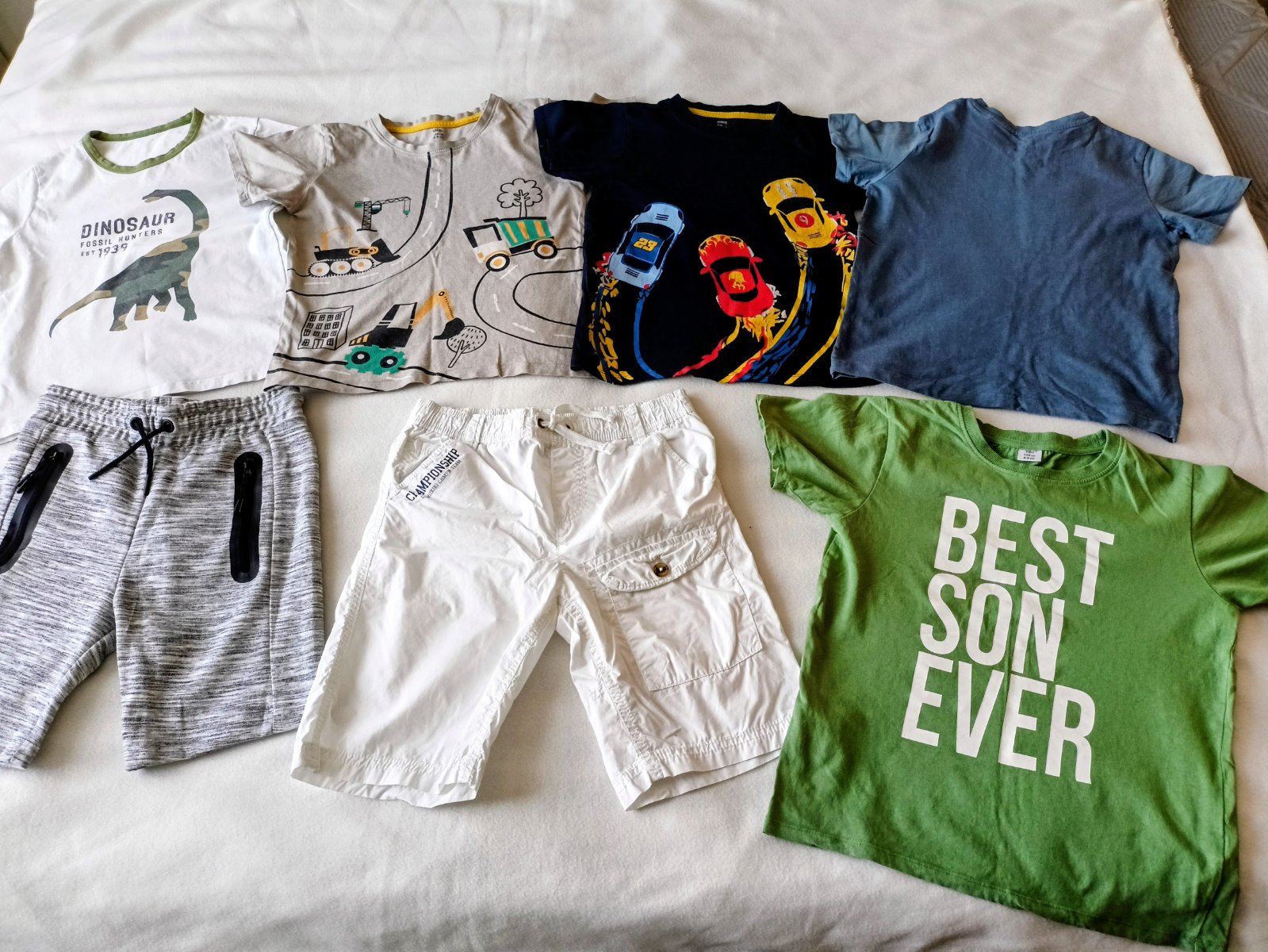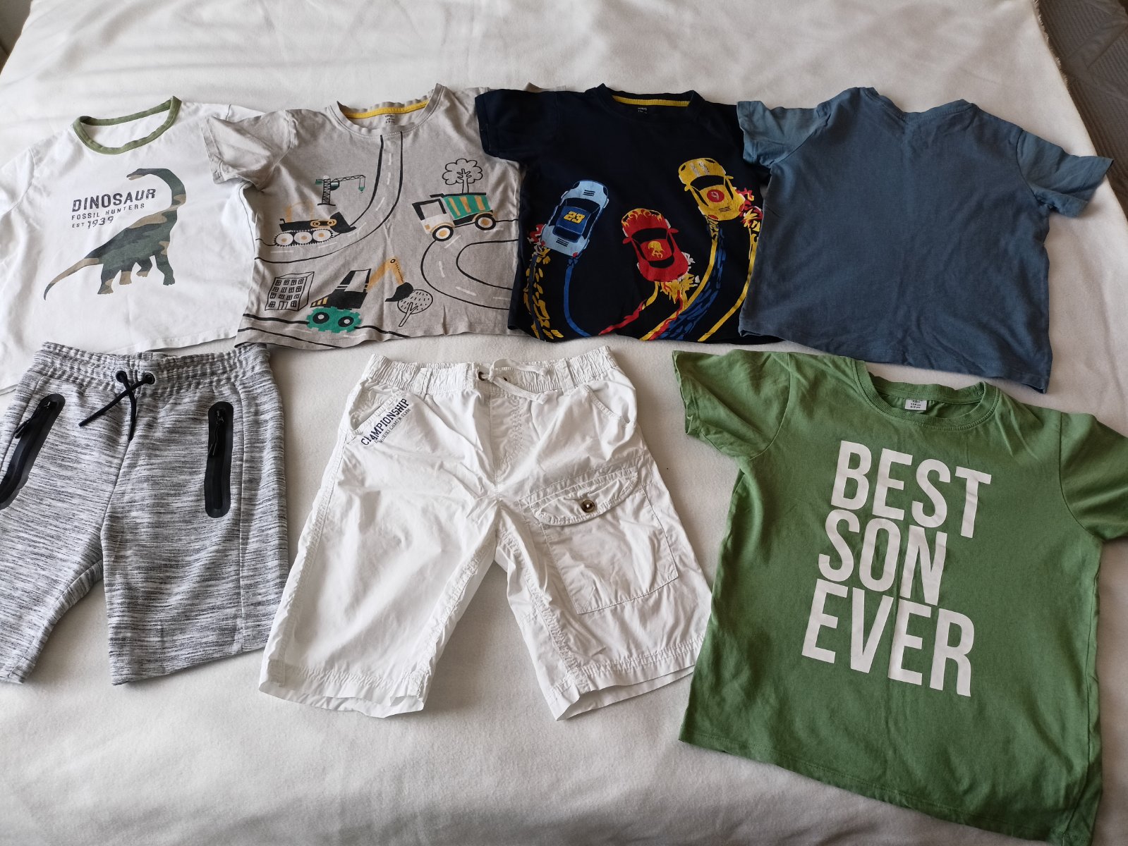 Prodám po synovi 5x letních triček (bavlna) a 2x delší kraťasy. Jedny teplákové v šedé barvě, druhé v bílé. Jsou stylové, bavlněné prodyšné, mají kapsy. Velikost pro chlapce 8-8,5 let (128/134) Vše v dobrém až velmi dobrém stavu.
