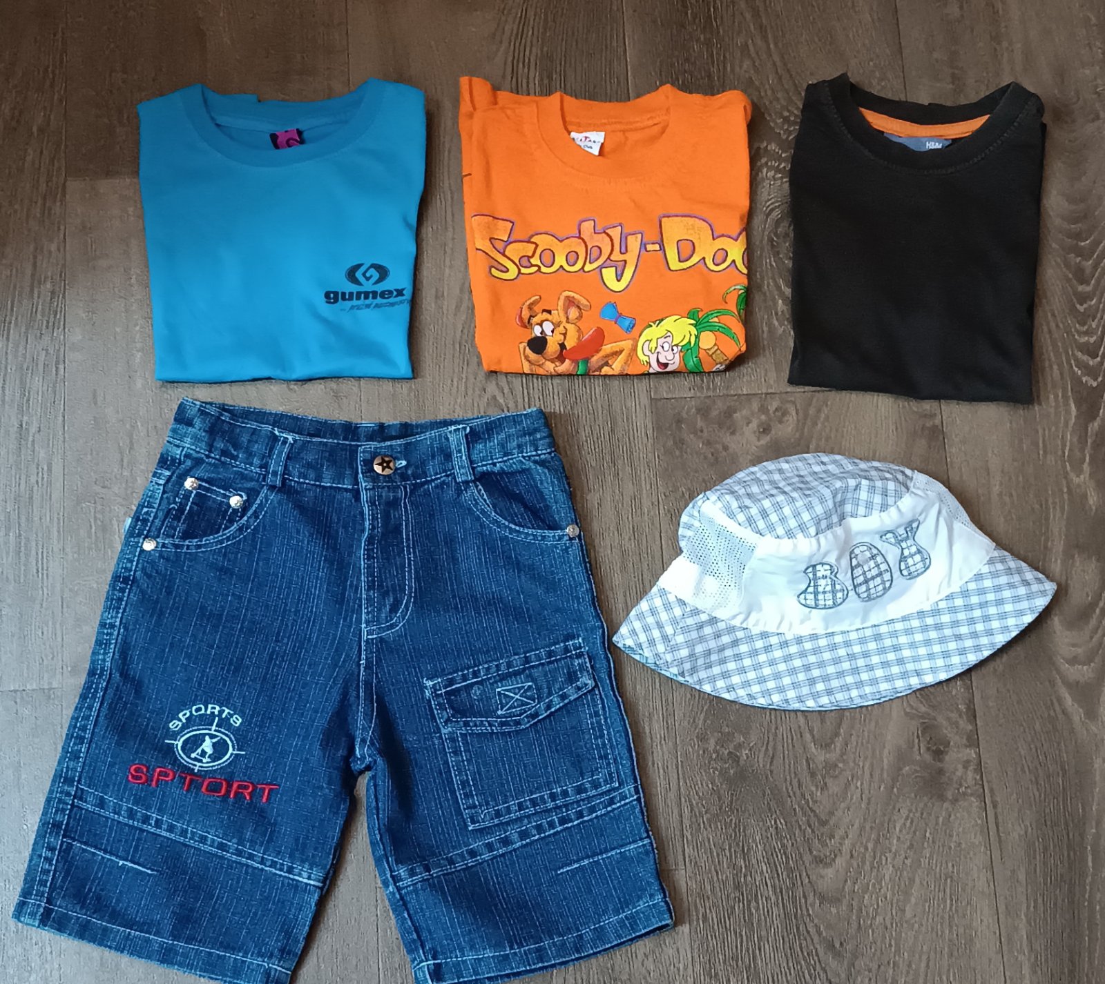Tmavě modré žínové kraťasy s regulací v pase, vpředu kapsa na suchý zip, letní klobouk s nápisem Boy, větrání - síťka, 2x tričko s krátkým rukávem a 1x hnědé tílko, zn. H&Na, cena za vše.