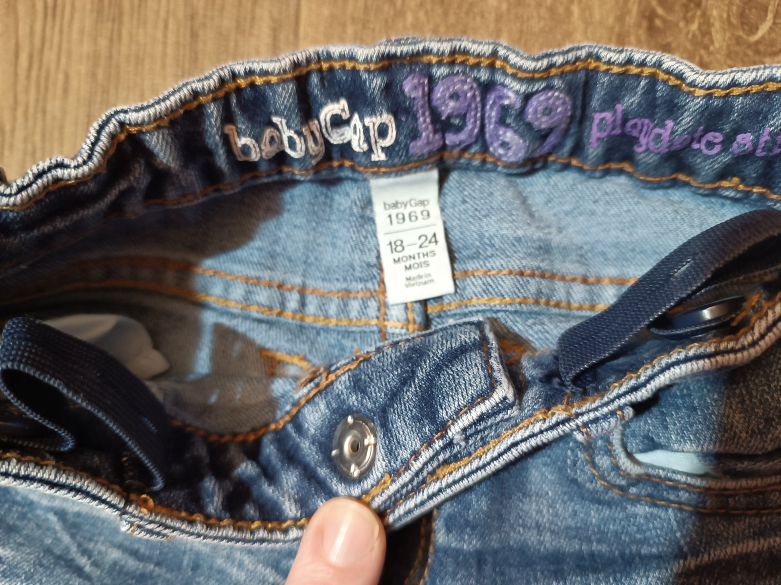 Džíny Baby Gap, vel. 18/24 měsíců. Zapínání na zip a knoflík, regulace šířky v pase, úchyty na pásek. V přední části 2 funkční kapsy, vzadu 2 funkční kapsy.