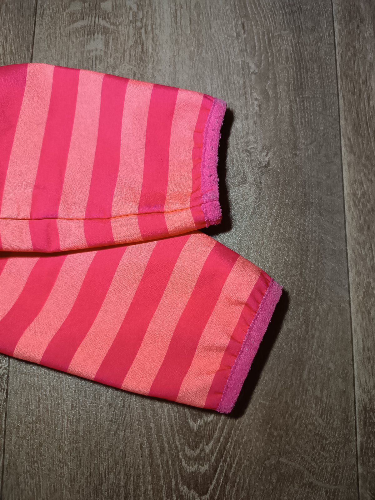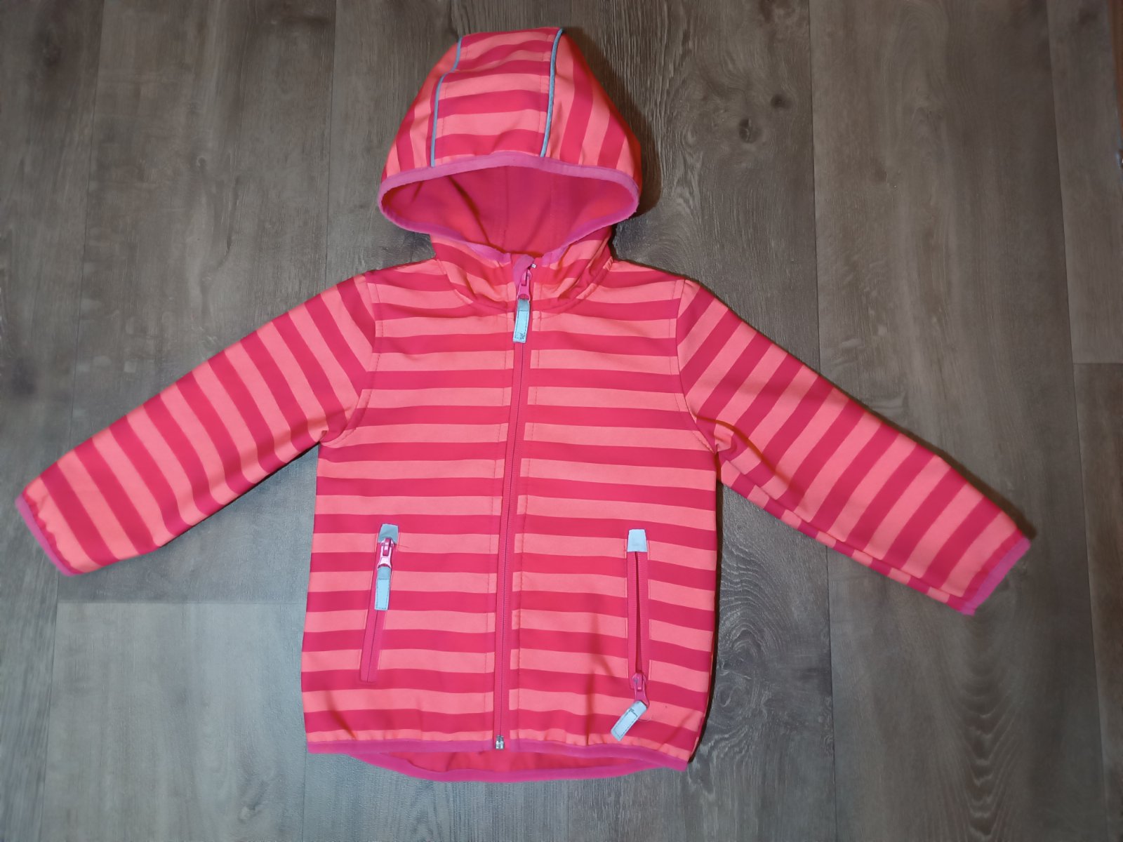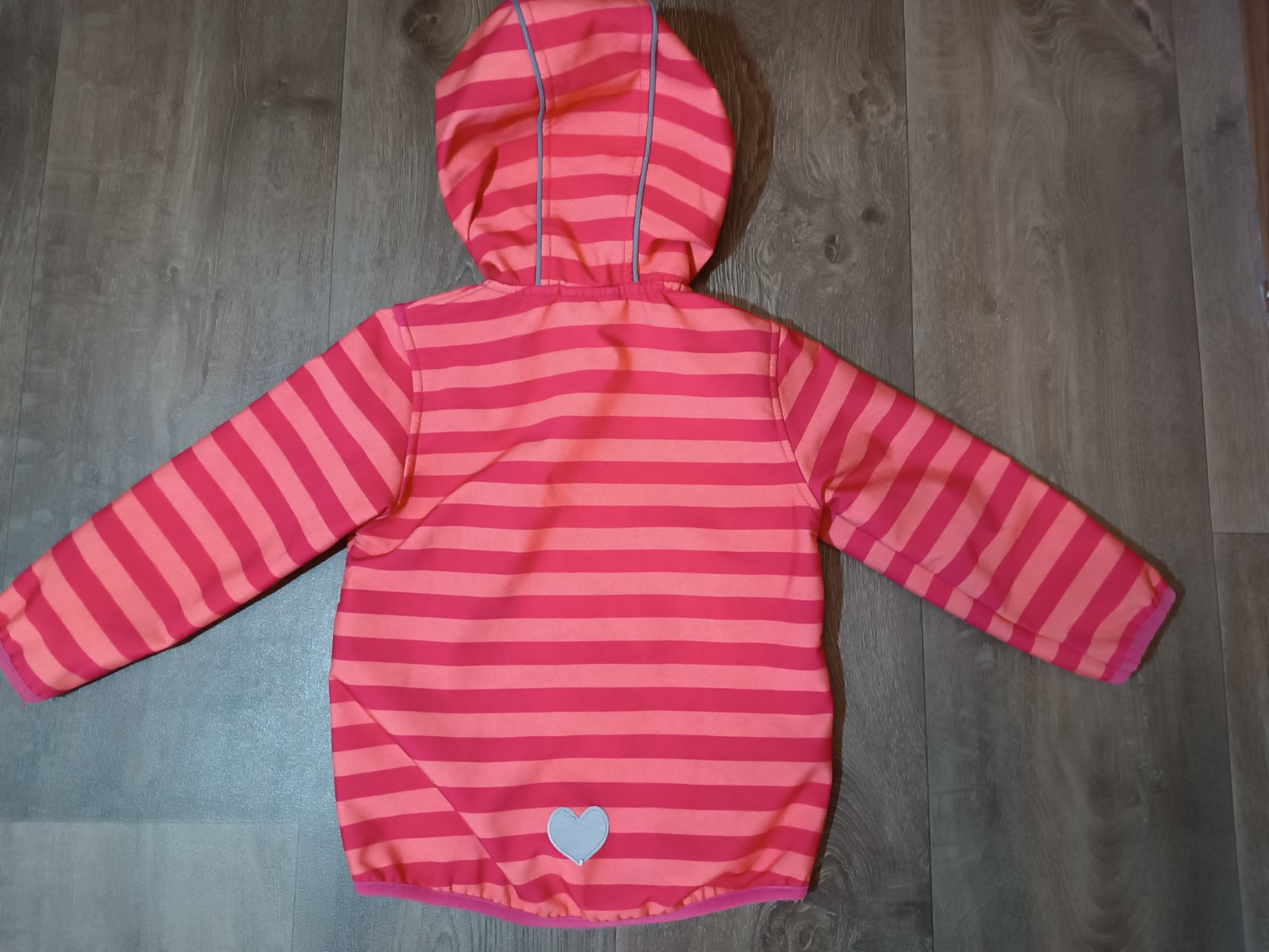 Softshellová bunda Topomini s kapucí, vel.92, oranžová+ červená barva, proužkovaná. Zapínání na zip, s ochranou bradičky.V přední části 2 funkční kapsy na zip. Vzadu reflexní srdíčko - jako bezpečnostní prvek. Top stav, pouze lemy okolo bundičky mají počínající žmolík - viz poslední 2 fotky.