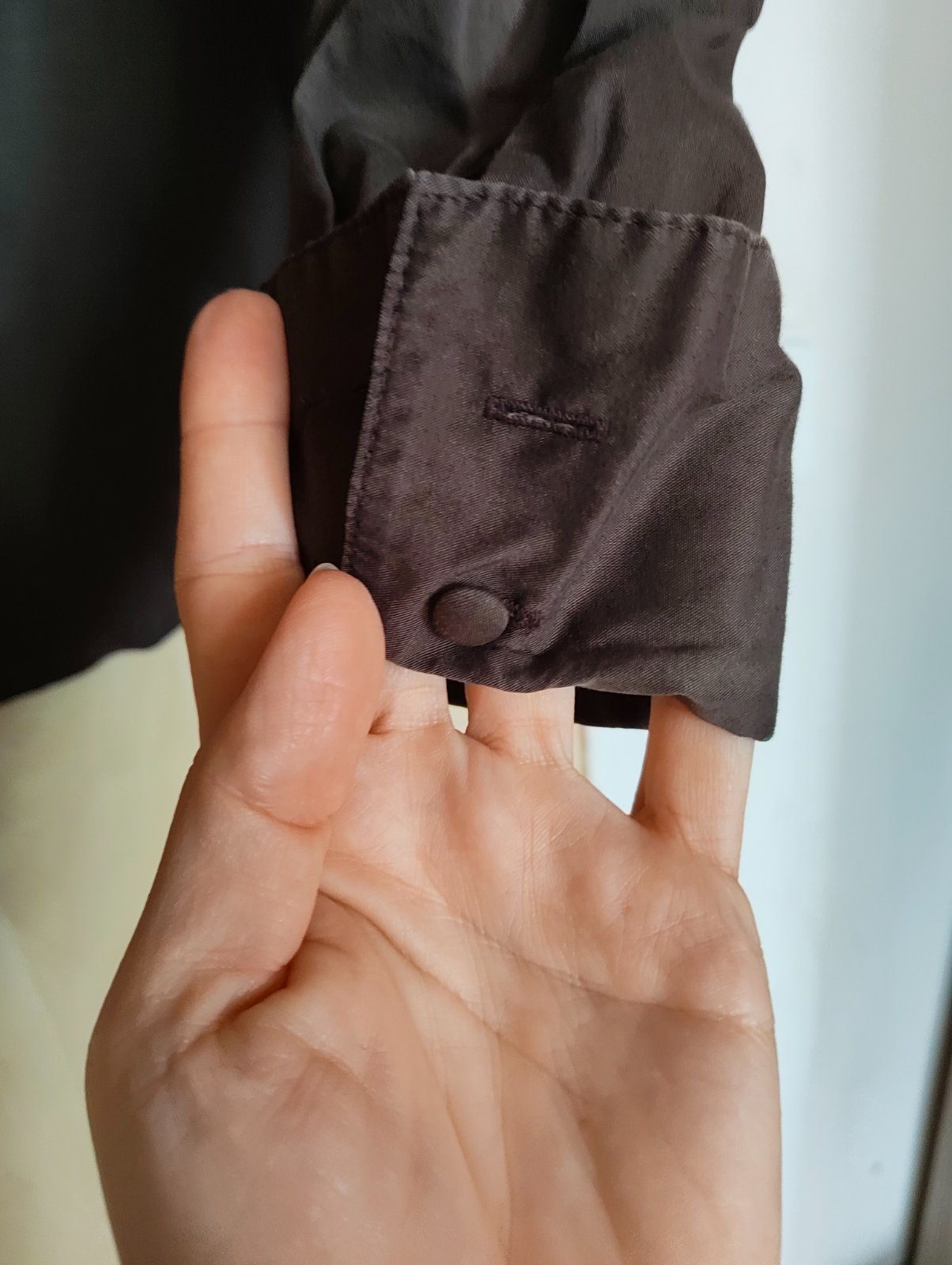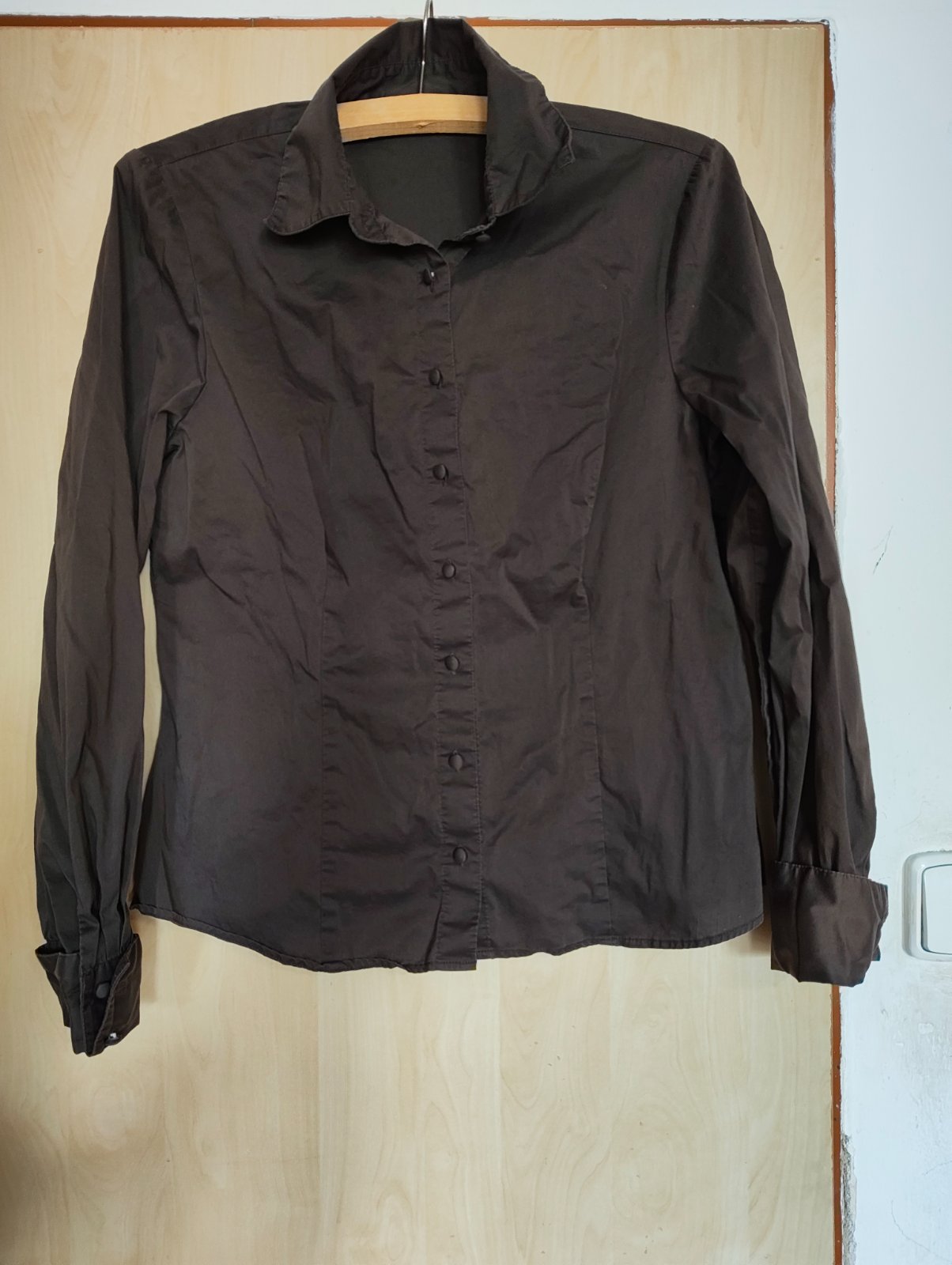 Elastická opnutá blůzka s hlubokým výstřihem, na jednom boku má skrytý zip. Šířka pod prsy 36 cm a ještě se natáhne o 10 cm. Barva je tmavě hnědá, není vyšisovaná, foťák to dělá světlejší.