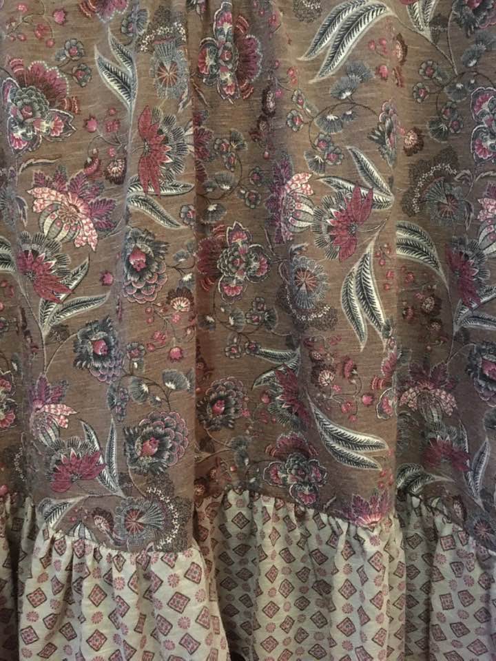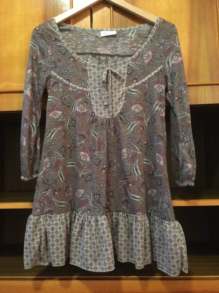 2079. nabízím k prodeji tento volný dlouhý top nebo pro malé možno i šaty, vel XS, Vila. Ve výstřihu je poutko s protaženou stuhou. Možno od mašle, nebo vytáhnout a použít jako pásek. Materiál teno...