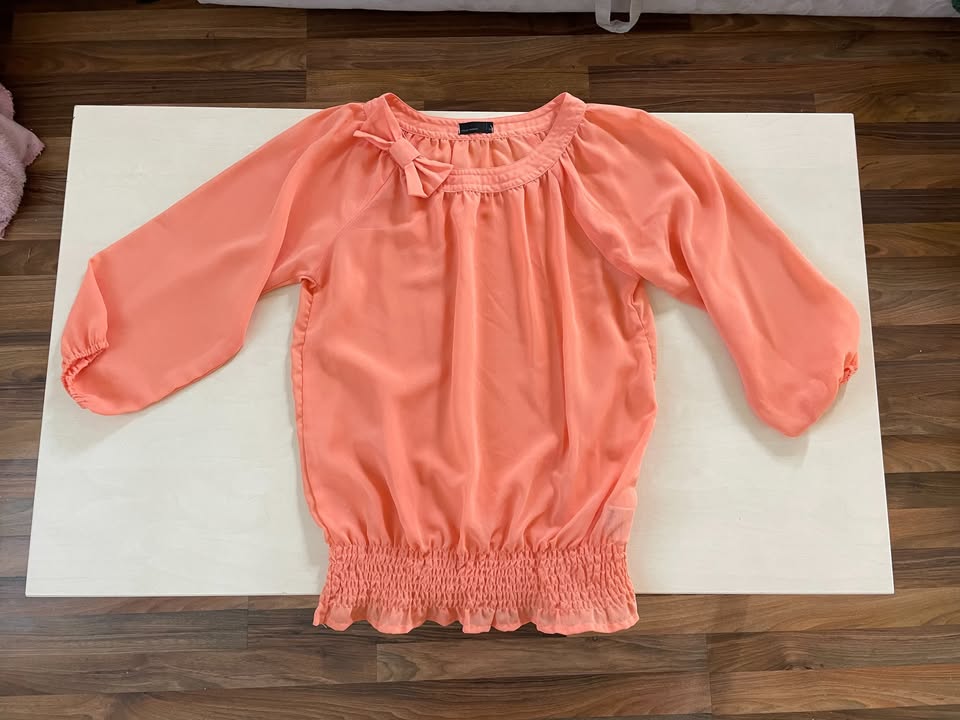 šk5. nabízím k prodeji tuto oranžovou/do meruňkové halenku s mašlí, vel M, Vero Moda. Materiál tenký zrnitý jako šifon, lehce prosvítá. 100% polyester. Dole stažen do žabičkování, u krku našita mašle. Nošená málo, bez vad, krásná