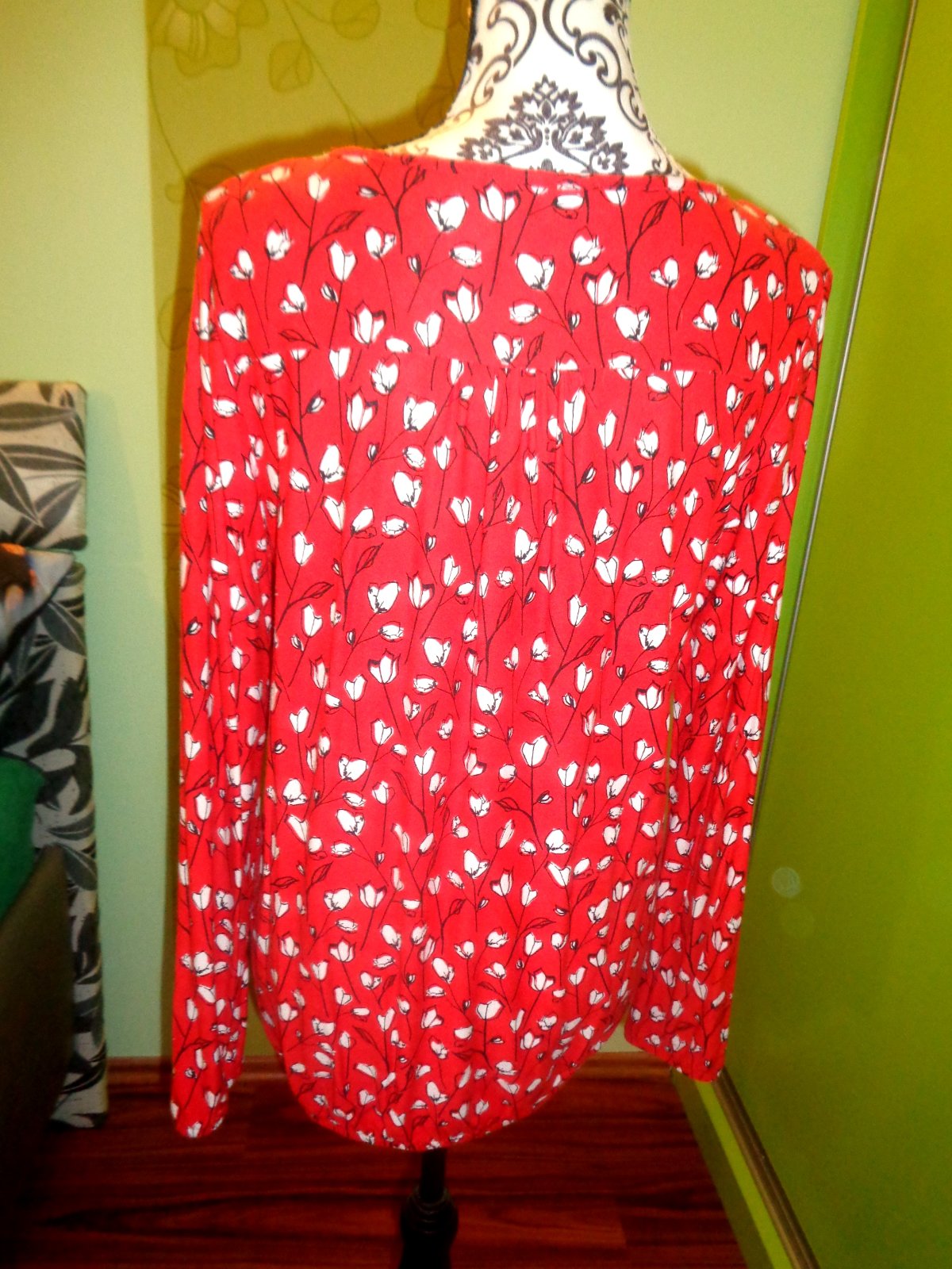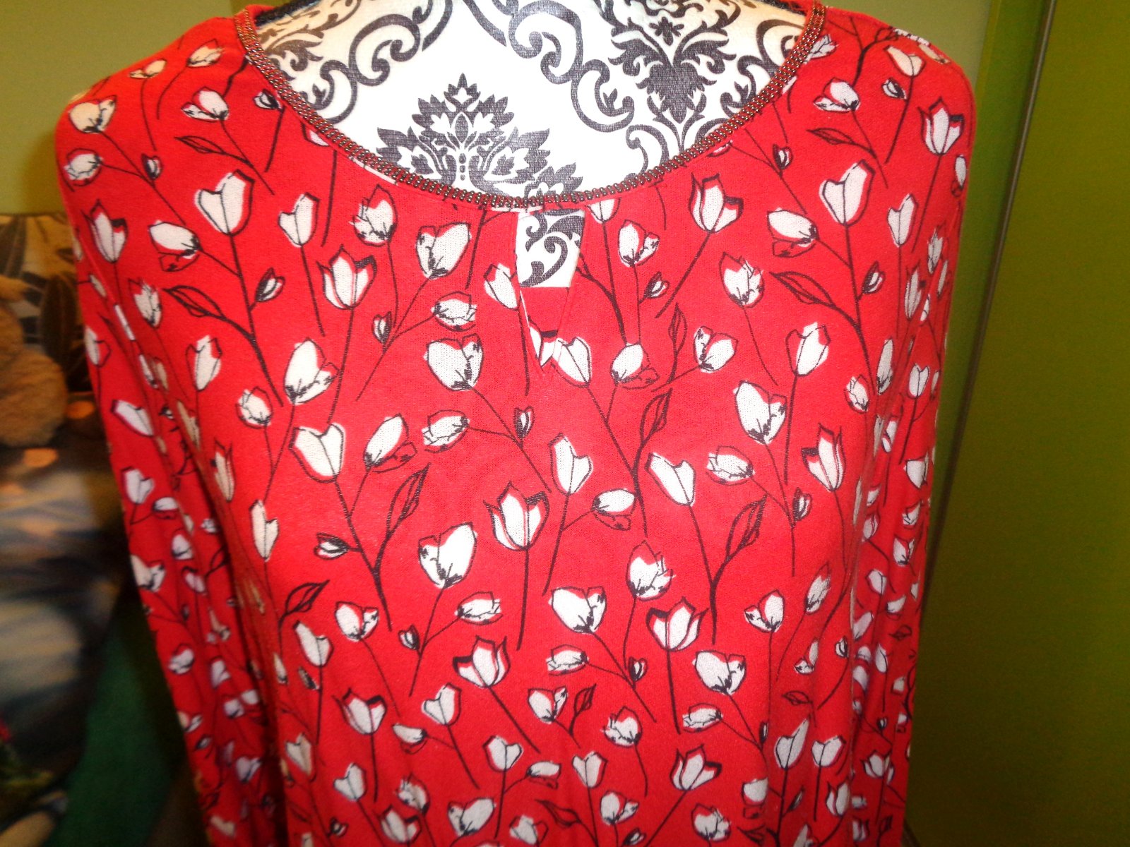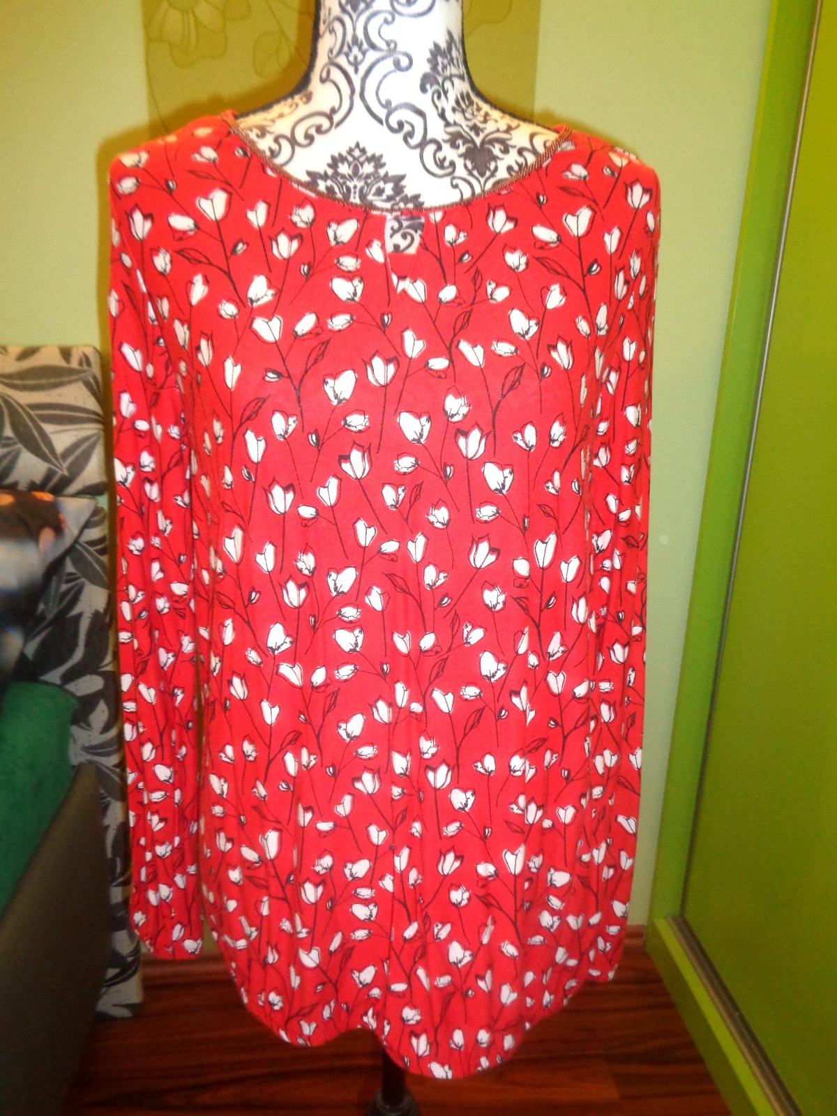 95% VISKOZA A 5% ELASTEN. RUKÁVY I SPODNÍ OKRAJ DO GUMKY. KRÁSNÁ ČERVENÁ BARVIČKA - BÍLÉ KVĚTY. NOŠENÁ- BEZ VADY. PSÁNA VELIKOST S, ALE JE VĚTŠÍ.