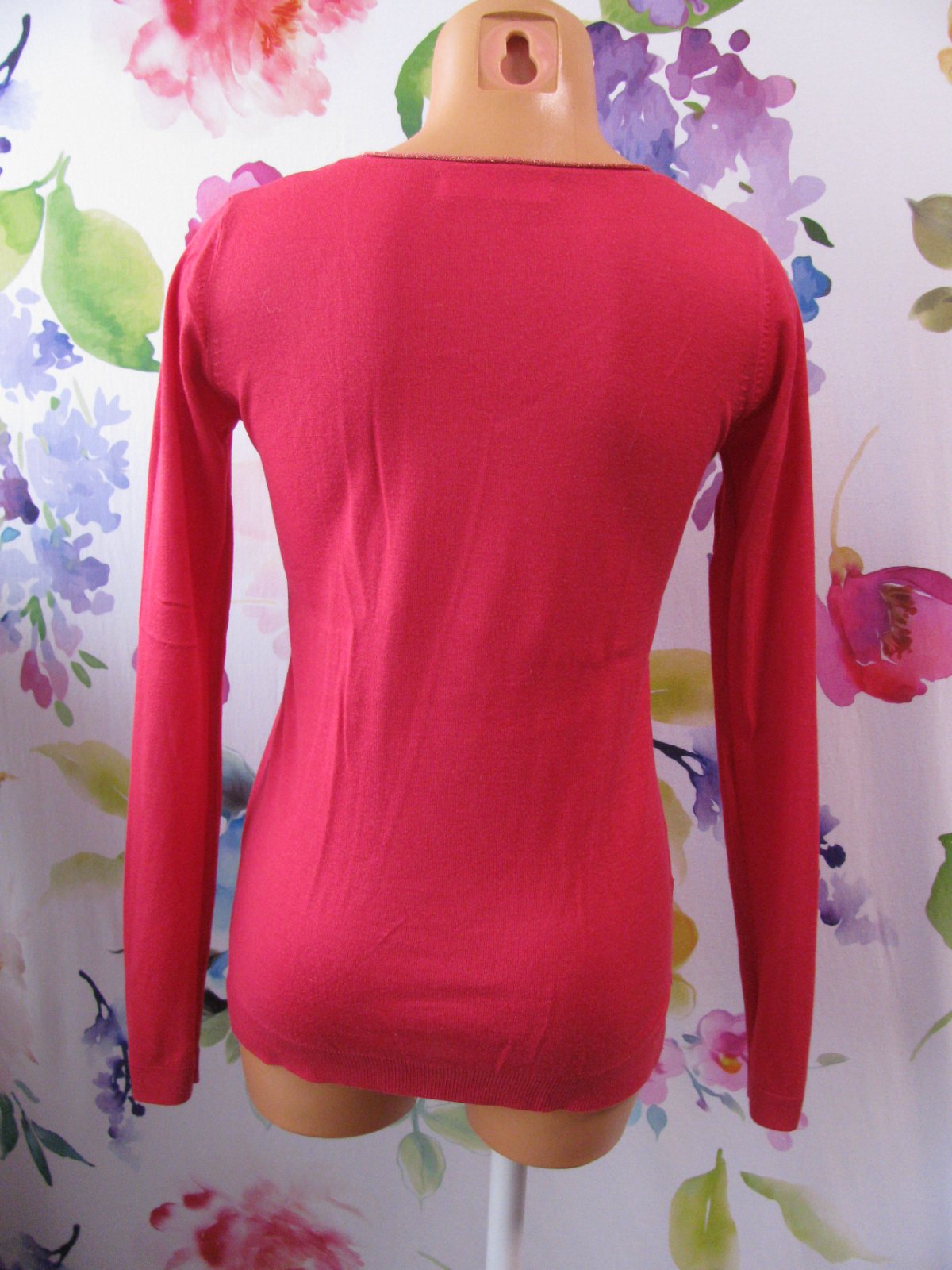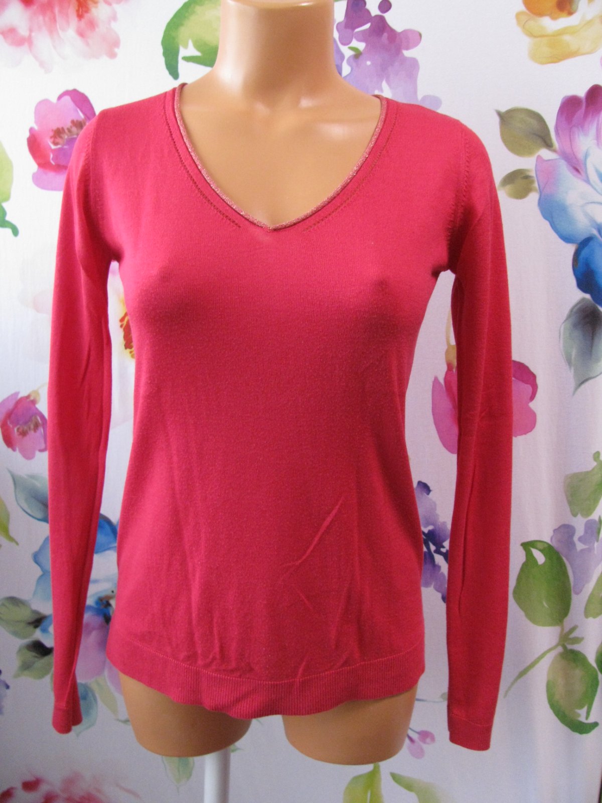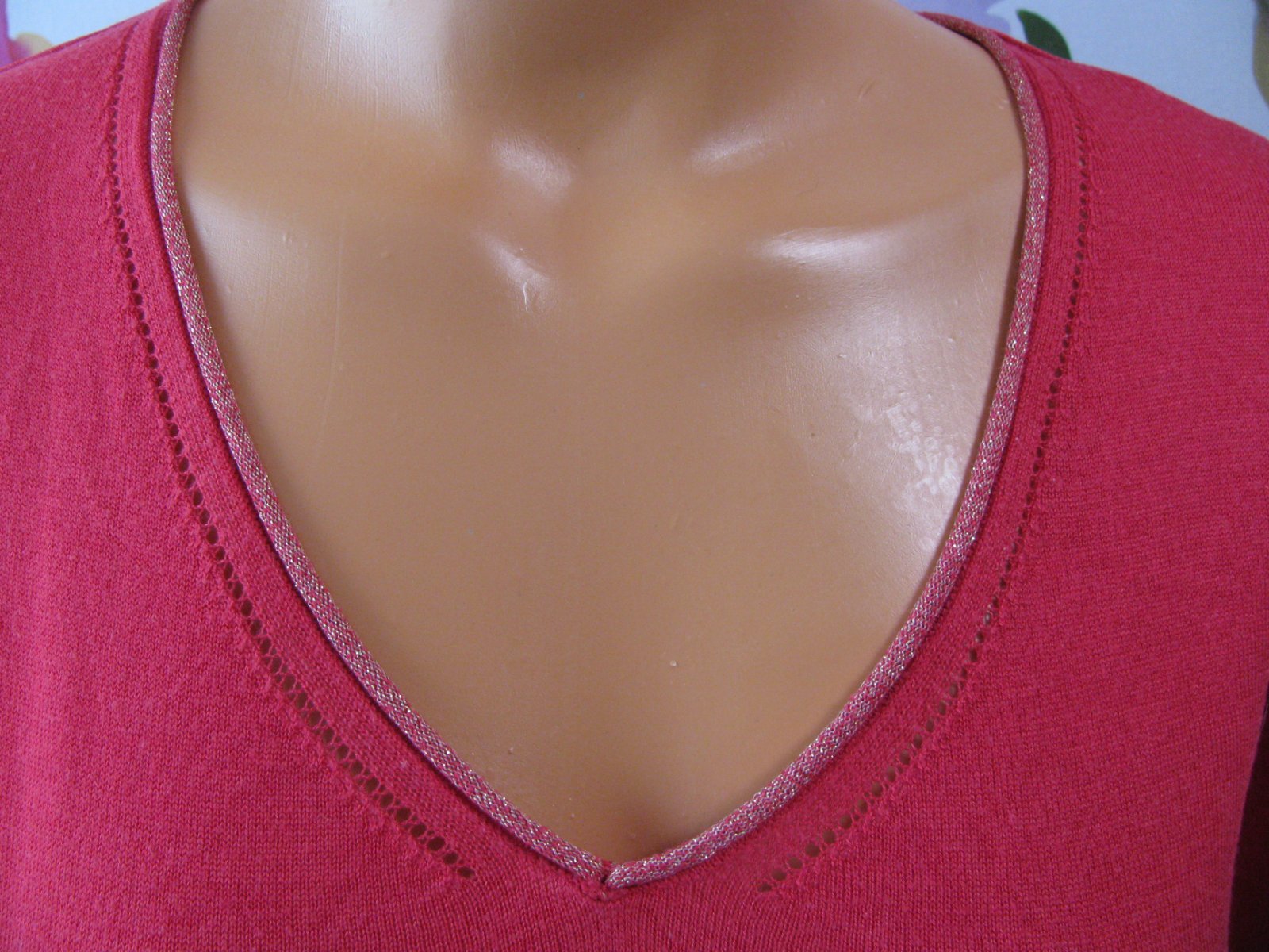 Krásná halenka jahodové barvy s elegantním výstřihem, štítky stran materiálu a velikosti ustřiženy, dle mne bavlna a viskoza. Top stav bez vady.